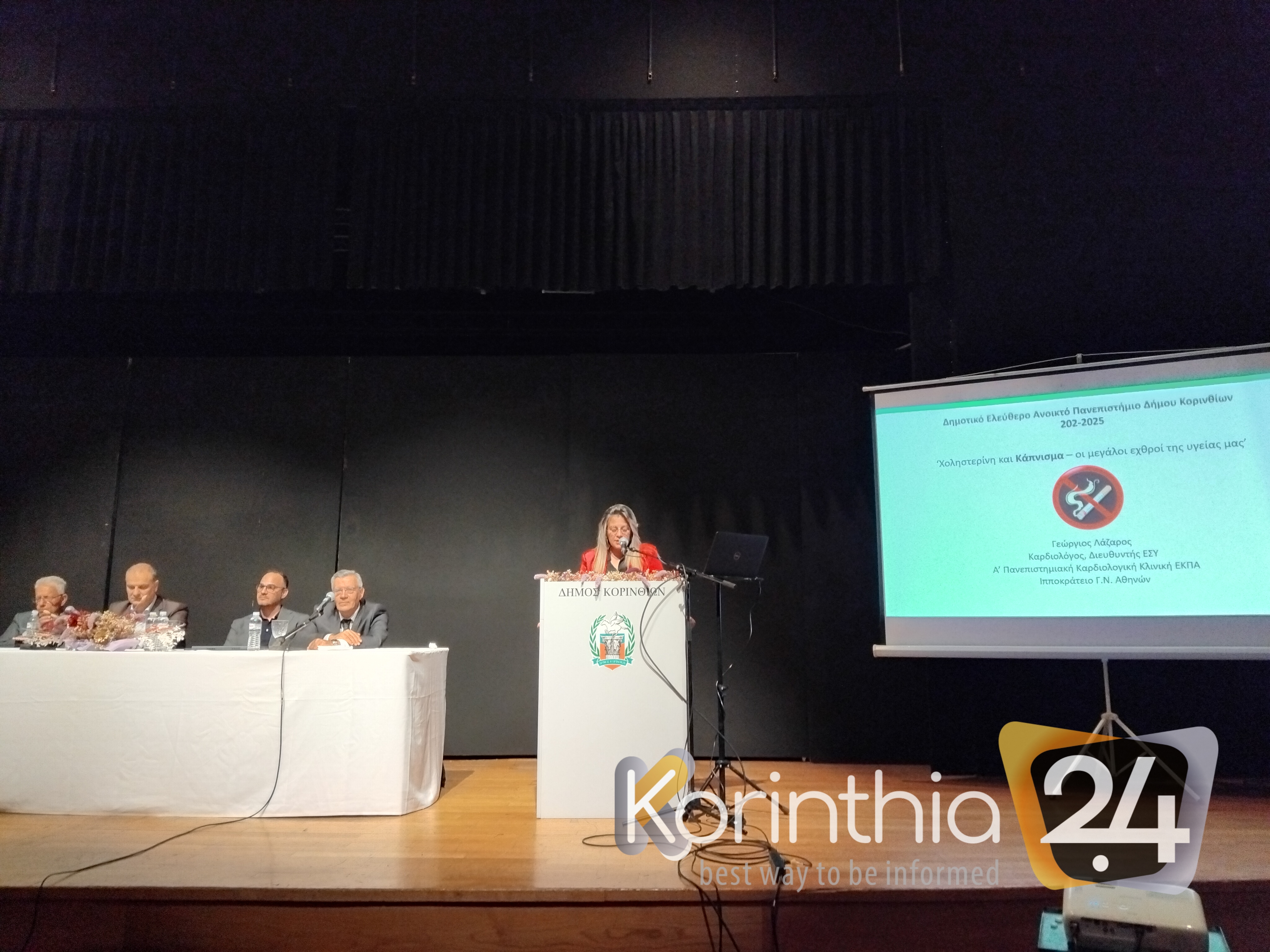 Πλήθος κόσμου γέμισε χθες το απόγευμα το Δημοτικό Θέατρο της Κορίνθου, καθώς ολοκληρώθηκε ο κύκλος μαθημάτων του πρώτου εξαμήνου του Δημοτικού Ελεύθερου Ανοιχτού Πανεπιστημίου του Δήμου Κορινθίων. Παρακολουθήσαμε μία πολύ ενδιαφέρουσα διάλεξη με θέμα το κάπνισμα και την χοληστερίνη: δύο από τα μεγαλύτερα προβλήματα που απειλούν την καθημερινή ζωή του σύγχρονου ανθρώπου.