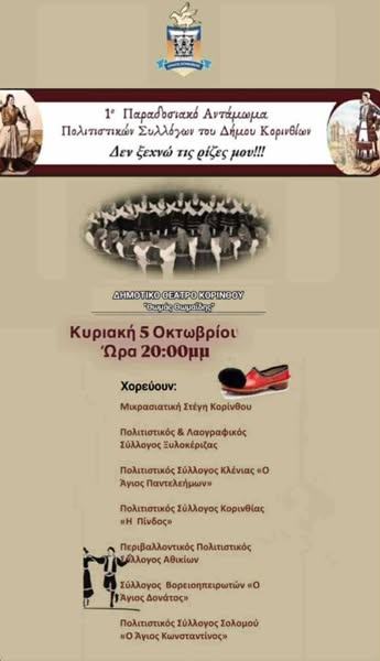 Την Κυριακή 5 Οκτωβρίου και ώρα 8:00 μ.μ. ολοκληρώνεται στο Δημοτικό θέατρο Κορίνθου "Θωμάς Θωμαΐδης"το εξ αναβολής λόγω καιρικών συνθηκών 3ο μέρος του 1ου Παραδοσιακού Ανταμώματος "Δεν ξεχνώ τις ρίζες μου" όπου συμμετέχει και το δικό μας χορευτικό τμήμα ενηλίκων.