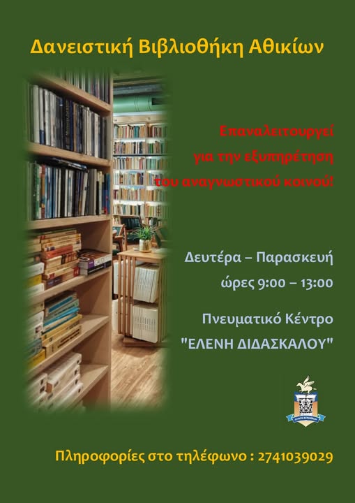 Η δανειστική βιβλιοθήκη του χωριού είναι και πάλι κοντά στους κατοίκους του, από Δευτέρα έως Παρασκευή, 9:00 – 13:00, στο Πνευματικό Κέντρο “Ελένη Διδασκάλου”.