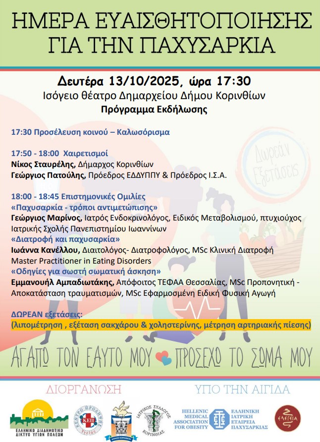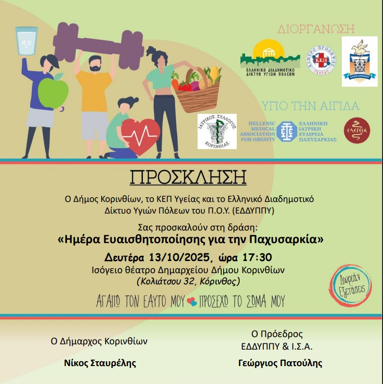 Ο Δήμος Κορινθίων, το ΚΕΠ Υγείας και το Ελληνικό Διαδημοτικό Δίκτυο Υγιών Πόλεων του Παγκόσμιου Οργανισμού Υγείας (ΕΔ ΔΥΠ ΠΟΥ) συνδιοργανώνουν εκδήλωση αφιερωμένη στην Ημέρα Ευαισθητοποίησης για την Παχυσαρκία, τη Δευτέρα 13 Οκτωβρίου 2025 και ώρα 17:30, στο μικρό θεατράκι του Δημαρχείου.