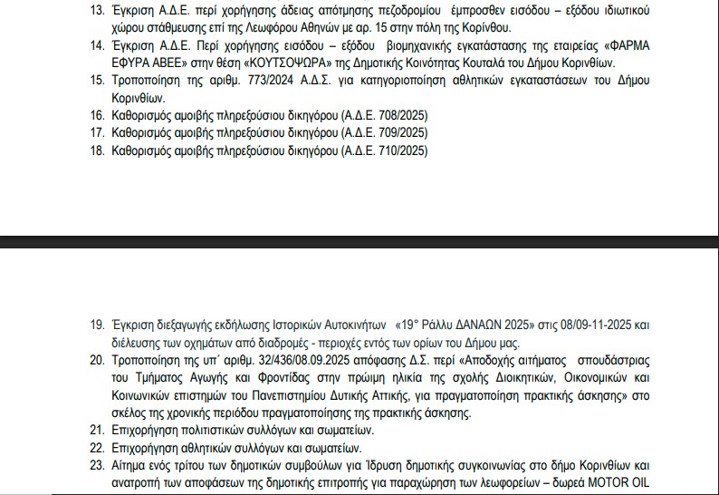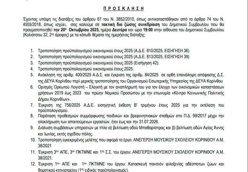ΚΟΡΙΝΘΙΑΚΑ ΔΗΜΟΣ ΚΟΡΙΝΘΙΩΝ ΔΗΜΟΤΙΚΑ ΣΥΜΒΟΥΛΙΑ Συνεδριάζει το δημοτικό συμβούλιο στην Κόρινθο Συνεδριάζει το δημοτικό συμβούλιο του δήμου Κορινθίων. Τη Δευτέρα 20 Οκτωβρίου 2025, ώρα 19.00 μμ. 17/10/2025 @ 09:43 Copied to clipboard Διαβάστε επίσης 31/10/2025 @ 09:29 Γιάννης Σιάτος: Το βαπόρι από την Σητεία πιάστηκε στην Κορινθία.... 31/10/2025 @ 08:30 Επανέρχεται ο Προσκοπισμός στην Κόρινθο 30/10/2025 @ 20:22 ΑΘ.ΔΟΥΡΟΣ: «Καμία εμπλοκή σε απευθείας αναθέσεις – Η στάση μας παραμένει διαφανής και θεσμική» 30/10/2025 @ 18:26 Δάφνη Εξαμιλίων: 5η Αγωνιστική / 02-11- 2025 30/10/2025 @ 14:54 ΝΙΚΟΣ ΣΤΑΥΡΕΛΗΣ: Οι τελευταίες πινελιές για το γήπεδο του Συνοικισμού μπήκαν σήμερα(ΦΩΤΟ+ΒΙΝΤΕΟ) Ροή ειδήσεων 31/10/2025 @ 18:30 Έναρξη συνεργασίας της ΔΗΜΟΠΡΑΚΤΟΣ Α.Ε. ΟΤΑ με τον Δήμο Καλυμνίων για την αξιοποίηση του φυσικού ιαματικού πόρου των Θερμών Καλύμνου» 31/10/2025 @ 18:00 Χρηματοδότηση νέας μονάδας αφαλάτωσης στον Δήμο Βέλου–Βόχας 31/10/2025 @ 17:30 Γ. Ψυχογιός: Κανένα λουκέτο στα ΕΛΤΑ της Κορινθίας! Παρέμβαση με Ερώτηση στη Βουλή 31/10/2025 @ 17:14 ΚΚΕ: Να σταματήσει το κλείσιμο καταστημάτων των ΕΛΤΑ. Να διασφαλιστεί ο δημόσιος και κοινωνικός χαρακτήρας τους 31/10/2025 @ 11:37 Ποιός Κορίνθιος χάρισε στον «Φραπέ» αυτοκίνητο μάρκας Τζάγκουαρ που είχε στο υπόγειο του;(ΒΙΝΤΕΟ) 31/10/2025 @ 11:06 Το φρούτο με τα περισσότερα φυτοφάρμακα στην Ελλάδα 31/10/2025 @ 10:44 Το Δ.Σ του Εργατικού Κέντρου Κιάτου είναι αντίθετο με το κλείσιμο των ΕΛΤΑ Κιάτου και διαμαρτύρεται έντονα. 31/10/2025 @ 10:30 Συνεχίζεται το Open Mall Λουτρακίου 31/10/2025 @ 10:27 ΚΙΑΤΟ : Τα θέματα που βάζει στην λογοδοσία δημάρχου η Επόμενη Μέρα 31/10/2025 @ 10:00 Ο Δήμος Λουτρακίου – Περαχώρας – Αγίων Θεοδώρων αντιδρά δυναμικά στο κλείσιμο των ΕΛΤΑ 31/10/2025 @ 09:50 Παναγιώτης Πιτσάκης: Οσμή ΟΠΕΚΕΠΕ στο Επιμελητήριο Κορινθίας! 31/10/2025 @ 09:30 Γ. Ψυχογιός: Η κυβέρνηση επενδύει στον διχασμό και εργαλειοποιεί Μνημεία για να κρύψει τη βαρβαρότητα της καθημερινότητας και τη “μεγάλη εικόνα” 31/10/2025 @ 09:29 Γιάννης Σιάτος: Το βαπόρι από την Σητεία πιάστηκε στην Κορινθία.... 31/10/2025 @ 09:25 ΛΟΥΤΡΑΚΙ: Συνέντευξη Τύπου – Παγκόσμιο Πρωτάθλημα Μη Ολυμπιακών Στυλ Πάλης 31/10/2025 @ 09:23 ΔΗΜΟΣ ΛΟΥΤΡΑΚΙΟΥ: Αντιδρούμε δυναμικά στο κλείσιμο των ΕΛΤΑ 31/10/2025 @ 09:21 Συνεχίζεται το Open Mall Λουτρακίου – Νέα φάση εργασιών & διασφαλισμένη χρηματοδότηση! 31/10/2025 @ 09:15 Γ. Ψυχογιός: Η κυβέρνηση επενδύει στον διχασμό και εργαλειοποιεί Μνημεία για να κρύψει τη βαρβαρότητα της καθημερινότητας και τη “μεγάλη εικόνα” 31/10/2025 @ 09:00 Επιμελητήριο Αρκαδίας: Ενημερωτική διαδικτυακή εκδήλωση για τις «Διοικητικές κυρώσεις για παραβάσεις σχετικά με την εμπορική δημοσιότητα (ΓΕΜΗ)» 31/10/2025 @ 08:30 Επανέρχεται ο Προσκοπισμός στην Κόρινθο 31/10/2025 @ 08:00 Σωματείο εργαζομένων ΔΕΥΑ Σικυωνίων: Όχι στο κλείσιμο του μοναδικού καταστήματος ΕΛΤΑ στο Κιάτο! Δείτε επίσης 31/10/2025 @ 11:37 Ποιός Κορίνθιος χάρισε στον «Φραπέ» αυτοκίνητο μάρκας Τζάγκουαρ που είχε στο υπόγειο του;(ΒΙΝΤΕΟ) 31/10/2025 @ 11:06 Το φρούτο με τα περισσότερα φυτοφάρμακα στην Ελλάδα 31/10/2025 @ 10:44 Το Δ.Σ του Εργατικού Κέντρου Κιάτου είναι αντίθετο με το κλείσιμο των ΕΛΤΑ Κιάτου και διαμαρτύρεται έντονα. 31/10/2025 @ 10:27 ΚΙΑΤΟ : Τα θέματα που βάζει στην λογοδοσία δημάρχου η Επόμενη Μέρα 31/10/2025 @ 09:50 Παναγιώτης Πιτσάκης: Οσμή ΟΠΕΚΕΠΕ στο Επιμελητήριο Κορινθίας! 30/10/2025 @ 14:54 ΝΙΚΟΣ ΣΤΑΥΡΕΛΗΣ: Οι τελευταίες πινελιές για το γήπεδο του Συνοικισμού μπήκαν σήμερα(ΦΩΤΟ+ΒΙΝΤΕΟ) 30/10/2025 @ 13:16 Η Επόμενη Μέρα για το κλείσιμο του καταστήματος ΕΛΤΑ στο Κιάτο 30/10/2025 @ 12:37 Ψήφισμα του δημοτικού συμβουλί