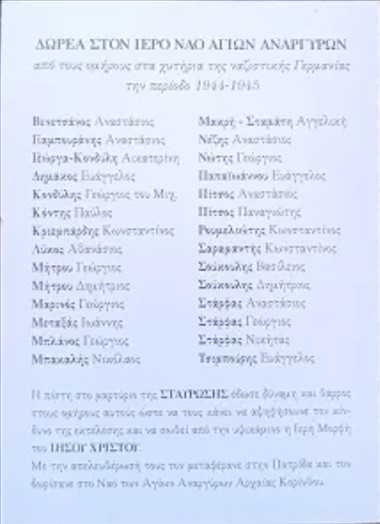 Οι 29 Αρχαιοκορίνθιοι είχαν έναν Σταυρό τον οποίο έκαναν τάμα να δωρίσουν στους Αγίους Αναργύρους, αν κατάφερναν να επιστρέψουν. Πάνω στον σταυρό είχαν χαράξει τα ονόματά τους, σε ανάμνηση των μαρτυρίων τους. Από τους 29 επέστρεψαν οι 28. Ένας από αυτούς, ο Φάνης Κεφάλας, δεν επέστρεψε ποτέ, αλλά ούτε και έμαθε ποτέ κανείς ποια ήταν η τύχη του.