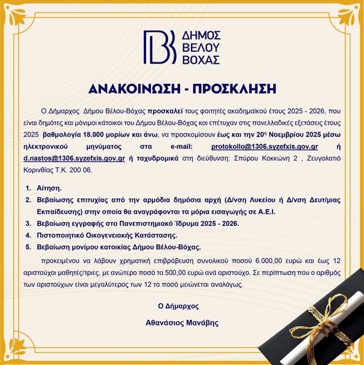 ΚΟΡΙΝΘΙΑΚΑ ΚΟΡΙΝΘΙΑ ΔΗΜΟΣ ΒΕΛΟΥ ΒΟΧΑΣ ΒΡΑΒΕΙΑ ΦΟΙΤΗΤΕΣ Βέλο - Βόχα: Πρόσκληση για χρηματική επιβράβευση αριστούχων εισαχθέντων στα ΑΕΙ στις 20 Νοεμβρίου 07/11/2025 @ 15:41 Copied to clipboard Διαβάστε επίσης 07/11/2025 @ 16:59 Φθινοπωρινή εξόρμηση στο Ναύπλιο έκανε το Ειδικό Δημοτικό Σχολείο Κορίνθου! 07/11/2025 @ 16:47 Ολοκλήρωση Εργασιών Ψεκασμού στο Αισθητικό Δάσος Πευκιά 07/11/2025 @ 16:41 Εκτεταμένοι καθαρισμοί φρεατίων και δικτύων απορροής στο Ξυλόκαστρο (ΦΩΤΟ) 07/11/2025 @ 16:26 Ολοκληρώθηκε ο Ηλεκτροφωτισμός της Περιφερειακής Οδού Δερβενίου 07/11/2025 @ 15:59 Κόρινθος: Ξεκίνησαν τα παραδοσιακά μαθήματα από το Σύλλογο « Ο Αγιος Παντελεήμων» (ΦΩΤΟ) Ροή ειδήσεων 07/11/2025 @ 16:59 Φθινοπωρινή εξόρμηση στο Ναύπλιο έκανε το Ειδικό Δημοτικό Σχολείο Κορίνθου! 07/11/2025 @ 16:47 Ολοκλήρωση Εργασιών Ψεκασμού στο Αισθητικό Δάσος Πευκιά 07/11/2025 @ 16:41 Εκτεταμένοι καθαρισμοί φρεατίων και δικτύων απορροής στο Ξυλόκαστρο (ΦΩΤΟ) 07/11/2025 @ 16:26 Ολοκληρώθηκε ο Ηλεκτροφωτισμός της Περιφερειακής Οδού Δερβενίου 07/11/2025 @ 16:13 ΚΟΡΙΝΘΟΣ: Δημόσια Ευχαριστήρια Επιστολή εργαζόμενης στον Αντιδήμαρχο Γιάννη Τσάκωνα 07/11/2025 @ 15:59 Κόρινθος: Ξεκίνησαν τα παραδοσιακά μαθήματα από το Σύλλογο « Ο Αγιος Παντελεήμων» (ΦΩΤΟ) 07/11/2025 @ 15:41 Βέλο - Βόχα: Πρόσκληση για χρηματική επιβράβευση αριστούχων εισαχθέντων στα ΑΕΙ 07/11/2025 @ 15:26 Συνάντηση του Υπουργού Υποδομών και Μεταφορών Χρίστου Δήμα με τον Αναπληρωτή Υπουργό Εξωτερικών των ΗΠΑ Michael Rigas 07/11/2025 @ 15:12 Καραχάλιος: Ο Νίκος Νικολόπουλος ήταν εκείνος που με έφερε σε επαφή με την Καρυστιανού 07/11/2025 @ 14:47 Αίτημα για άμεση χρηματοδότηση των σχολικών μονάδων του Δήμου Κορινθίων 07/11/2025 @ 14:03 ΟΠΑΔΙΚΗ ΒΙΑ Χαλκίδα: VIDEO από τη στιγμή της δολοφονίας του 20χρονου 07/11/2025 @ 13:48 Γ. Ψυχογιός:Η κυβέρνηση διαλύει έναν έναν τους δημόσιους πυλώνες στην περιφέρεια και δεν αντιμετωπίζει την ενεργειακή φτώχεια - Απαραίτητη η ισχυρή παρουσία του Κράτους παντού 07/11/2025 @ 12:29 ΗΠΑ, Ελλάδα, Κύπρος και Ισραήλ ενισχύουν το κοινό μέτωπο για ενεργειακή ασφάλεια στην Αν. Μεσόγειο 07/11/2025 @ 12:11 Από αύριο ξεκινάει η 24ωρη παρουσία αστυνομικών σε 25 περιοχές με Ρομά - Προσλαμβάνονται και 50 διαμεσολαβητές 07/11/2025 @ 12:10 Aνοιχτοί οι αμπελώνες την Κυριακή 9 Νοεμβρίου 2025 07/11/2025 @ 12:04 Δείτε ζωντανά το ετήσιο συνεδριο της ΚΕΔΕ 07/11/2025 @ 08:00 Ρεσιτάλ πιάνου ενός Νέου Μουσικού στο Καλογεροπούλειο Ίδρυμα! 06/11/2025 @ 20:00 Το Λουτράκι κατακτά τα social media – Εκατομμύρια προβολές σε λίγες μέρες 06/11/2025 @ 17:30 Ταυτοποίηση δύο δραστών σε υπόθεση κλοπής στη Χερσαία Ζώνη Λιμένα Κορίνθου 06/11/2025 @ 17:29 Ξυλόκαστρο: Συνεδριάζει η Δημοτική Επιτροπή τη Δευτερά 10 Νοεμβρίου Δείτε επίσης 07/11/2025 @ 16:13 ΚΟΡΙΝΘΟΣ: Δημόσια Ευχαριστήρια Επιστολή εργαζόμενης στον Αντιδήμαρχο Γιάννη Τσάκωνα 07/11/2025 @ 14:47 Αίτημα για άμεση χρηματοδότηση των σχολικών μονάδων του Δήμου Κορινθίων 07/11/2025 @ 14:03 ΟΠΑΔΙΚΗ ΒΙΑ Χαλκίδα: VIDEO από τη στιγμή της δολοφονίας του 20χρονου 07/11/2025 @ 13:48 Γ. Ψυχογιός:Η κυβέρνηση διαλύει έναν έναν τους δημόσιους πυλώνες στην περιφέρεια και δεν αντιμετωπίζει την ενεργειακή φτώχεια - Απαραίτητη η ισχυρή παρουσία του Κράτους παντού 07/11/2025 @ 12:29 ΗΠΑ, Ελλάδα, Κύπρος και Ισραήλ ενισχύουν το κοινό μέτωπο για ενεργειακή ασφάλεια στην Αν. Μεσόγειο 07/11/2025 @ 12:11 Από αύριο ξεκινάει η 24ωρη παρουσία αστυνομικών σε 25 περιοχές με Ρομά - Προσλαμβάνονται και 50 διαμεσολαβητές 06/11/2025 @ 13:27 ΚΟΡΙΝΘΟΣ: Το Λιμενικό βρήκε τους κλέφτες 06/11/2025 @ 12:07 Νίκος Ταγαράς: Εντός του 2026 η καταγραφή των κοινόχρηστων δρόμων σε νησιωτική και ηπει