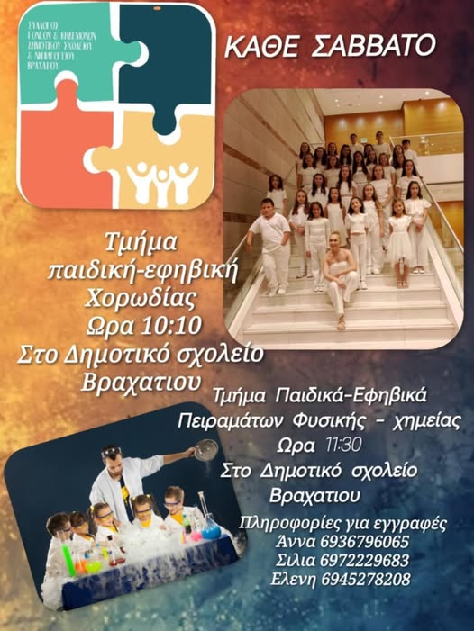 Ο Σύλλογος Γονέων και Κηδεμόνων Δημοτικού Σχολείου και Νηπιαγωγείου Βραχατίου σας ενημερώνει με χαρά και ενθουσιασμό ότι θα συνεχίσει και φέτος την επιτυχημένη χορωδία με διευθύνουσα την αξιόλογη μουσικό κα Γκρεκα Πετούμενου. Είμαστε έτοιμοι λοιπόν για νέες εμπειρίες και όμορφες διαδρομές με πλούσια βραβεία και πολύ καλές κριτικές από αξιοσέβαστους μουσικούς και μεγάλους μαέστρους.