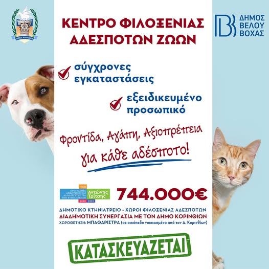 Με δικά του χρήματα ο Δήμος θα φροντίσει τα αδέσποτα!! Το λέμε συνέχεια και θα το λέμε κάθε μέρα: μόλις δύο χρόνια μετά την ανάληψη της δημοτικής αρχής, ο Δήμος Βέλου–Βόχας δεν έχει να ζηλέψει τίποτα από κανέναν – ούτε στη φροντίδα των αδέσποτων ζώων.