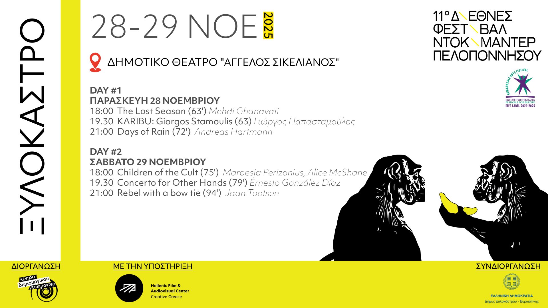 Το Δημοτικό Θέατρο «Άγγελος Σικελιανός» φιλοξενεί για δύο ημέρες (28 & 29 Νοεμβρίου) επιλεγμένα ντοκιμαντέρ του 11ου Διεθνούς Φεστιβάλ Ντοκιμαντέρ Πελοποννήσου, με ιστορίες από όλο τον κόσμο, που ανοίγουν συζήτηση για το περιβάλλον, τον αθλητισμό, τη μουσική, την κοινωνία και τη δημοκρατία.