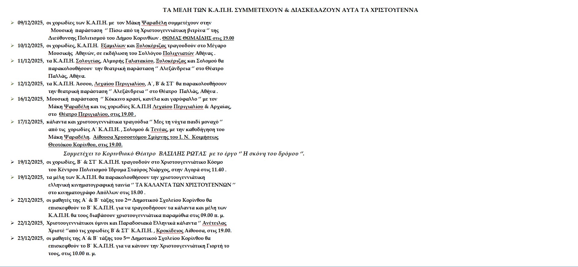 ΚΟΡΙΝΘΙΑΚΑ ΔΗΜΟΣ ΚΟΡΙΝΘΙΩΝ ΚΑΠΗ ΧΡΙΣΤΟΥΓΕΝΝΙΑΤΙΚΕΣ ΕΚΔΗΛΩΣΕΙΣ Αυτές είναι οι Χριστουγεννιάτικες εκδηλώσεις για τα ΚΑΠΗ του δήμου Κορινθίων Αναλυτικά το πρόγραμμα των εκδηλώσεων για την τρίτη ηλικία. 05/12/2025 @ 10:03 Copied to clipboard Διαβάστε επίσης 05/12/2025 @ 12:58 Ο Εμπορικός Σύλλογος Κορίνθου στηρίζει τους αγρότες της Κορινθίας και όλης της Ελλάδας 05/12/2025 @ 10:13 Μαθητές του 2ου Λυκείου Κορίνθου επισκέφθηκαν τον Σεβ. Μητροπολίτη κ. Παύλο στα γραφεία της Ι. Μητροπόλεως. 05/12/2025 @ 10:05 Ζητείται προς ενοικίαση βιομηχανικός χώρος για αποθήκευση εμφιαλωμένου νερού 05/12/2025 @ 07:32 Δράσεις Συμπερίληψης του Ειδικού Νηπιαγωγείου με το 1ο Νηπιαγωγείο Κορίνθου 05/12/2025 @ 07:29 KOΡΙΝΘΟΣ:Η αλήθεια για τις «έξυπνες διαβάσεις» Ροή ειδήσεων 05/12/2025 @ 12:58 Ο Εμπορικός Σύλλογος Κορίνθου στηρίζει τους αγρότες της Κορινθίας και όλης της Ελλάδας 05/12/2025 @ 12:30 «Απασφάλισε» ο Πιτσάκης. Καταθέτει στον Εισαγγελέα 05/12/2025 @ 12:25 2ο Περιφερειακό Συμβούλιο Νέων Πελοποννήσου 2025-26 05/12/2025 @ 12:18 Λειψυδρία: Μικρή χαραμάδα αισιοδοξίας λόγω κακοκαιρίας – Ενισχύθηκαν κατά 15 εκατ. κυβικά τα αποθέματα της ΕΥΔΑΠ 05/12/2025 @ 11:41 Ο Σεβ. Μητροπολίτης κ. Παύλος επισκέφθηκε την ορεινή Κορινθία (ΦΩΤΟ) 05/12/2025 @ 11:25 Ξυλόκαστρο: Φωταγώγηση του Χριστουγεννιάτικου δέντρου στο Καμάρι την Κυριακή 7 Δεκεμβρίου 05/12/2025 @ 11:16 ΚΟΡΙΝΘΙΑ: Κοινό δελτίο τύπου αγροτών/κτηνοτρόφων και ταξιτζήδων Αττικής 05/12/2025 @ 10:13 Μαθητές του 2ου Λυκείου Κορίνθου επισκέφθηκαν τον Σεβ. Μητροπολίτη κ. Παύλο στα γραφεία της Ι. Μητροπόλεως. 05/12/2025 @ 10:05 Ζητείται προς ενοικίαση βιομηχανικός χώρος για αποθήκευση εμφιαλωμένου νερού 05/12/2025 @ 10:03 Αυτές είναι οι Χριστουγεννιάτικες εκδηλώσεις για τα ΚΑΠΗ του δήμου Κορινθίων 05/12/2025 @ 09:33 Επιμελητήριο: Εκκωφαντική σιωπή... Τι κάνει το Υπουργείο; 05/12/2025 @ 09:31 Αννίβας Παπακυριάκος: Όποιος γνωρίζει ελάχιστα πρόσωπα, συμπεριφορές και χαρακτήρες καταλαβαίνει. 05/12/2025 @ 08:46 Ο αστυνομικός της ομάδας Ζ που έγινε παράνομος: Οι οκτώ ληστείες, η ενέδρα θανάτου και η ζωή δίπλα στον Μάκη Ψωμιάδη(ΒΙΝΤΕΟ) 05/12/2025 @ 07:32 Δράσεις Συμπερίληψης του Ειδικού Νηπιαγωγείου με το 1ο Νηπιαγωγείο Κορίνθου 05/12/2025 @ 07:29 KOΡΙΝΘΟΣ:Η αλήθεια για τις «έξυπνες διαβάσεις» 04/12/2025 @ 22:23 KIATO-Περικλής Γκούμας: Η καθαριότητα των κάδων είναι ζήτημα δημόσιας υγείας. 04/12/2025 @ 22:09 Πλήθος κόσμου στην 2η συνάντηση μελών και φίλων της παράταξης μας «Ορίζοντες Δημιουργίας» 04/12/2025 @ 19:54 Σκάνδαλο με «έξυπνα» υδρόμετρα . Τι γίνεται στην Κορινθία; 04/12/2025 @ 19:09 Δήμος Νεμέας: Παρακαλούμε τους πολίτες να είναι προσεκτικοί, παρατηρούνται καθιζήσεις όπου εκτελούνται εργασίες για το έργο του βιολογικού 04/12/2025 @ 19:05 Πρόγραμμα εορτασμού του Αγίου Νικολάου στο Ζευγολατιό Δείτε επίσης 05/12/2025 @ 12:18 Λειψυδρία: Μικρή χαραμάδα αισιοδοξίας λόγω κακοκαιρίας – Ενισχύθηκαν κατά 15 εκατ. κυβικά τα αποθέματα της ΕΥΔΑΠ 05/12/2025 @ 11:16 ΚΟΡΙΝΘΙΑ: Κοινό δελτίο τύπου αγροτών/κτηνοτρόφων και ταξιτζήδων Αττικής 05/12/2025 @ 10:03 Αυτές είναι οι Χριστουγεννιάτικες εκδηλώσεις για τα ΚΑΠΗ του δήμου Κορινθίων 05/12/2025 @ 09:31 Αννίβας Παπακυριάκος: Όποιος γνωρίζει ελάχιστα πρόσωπα, συμπεριφορές και χαρακτήρες καταλαβαίνει. 05/12/2025 @ 08:46 Ο αστυνομικός της ομάδας Ζ που έγινε παράνομος: Οι οκτώ ληστείες, η ενέδρα θανάτου και η ζωή δίπλα στον Μάκη Ψωμιάδη(ΒΙΝΤΕΟ) 05/12/2025 @ 07:32 Δράσεις Συμπερίληψης του Ειδικού Νηπιαγωγείου με το 1ο Νηπιαγωγείο Κορίνθου 05/12/2025 @ 07:29 KOΡΙΝΘΟΣ:Η αλήθεια για τις «έξυπνες διαβάσεις» 04/12/2025 @ 13:07 Φρίκη στην Αργολίδα – Οικογένεια Ρομά 