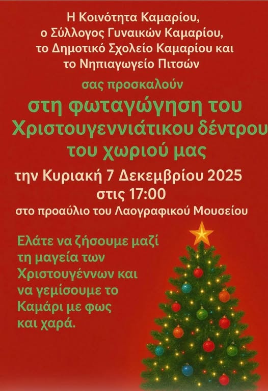 05/12/2025 @ 11:25 Ξυλόκαστρο: Φωταγώγηση του Χριστουγεννιάτικου δέντρου στο Καμάρι την Κυριακή 7 Δεκεμβρίου