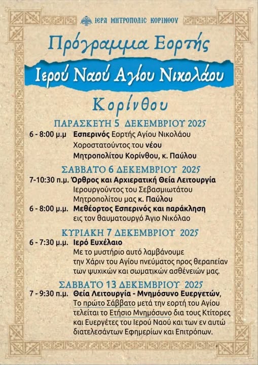 ΚΟΡΙΝΘΙΑΚΑ ΚΟΡΙΝΘΙΑ ΔΗΜΟΣ ΚΟΡΙΝΘΙΩΝ ΙΕΡΑ ΜΗΤΡΟΠΟΛΗ ΑΓΙΟΣ ΝΙΚΟΛΑΟΣ Κόρινθος: Πρόγραμμα εορτασμού του Αγίου Νικολάου 06/12/2025 @ 07:00 Copied to clipboard Διαβάστε επίσης 06/12/2025 @ 17:19 Ο Επισκευαστικός κλάδος Αυτοκινήτων Ν. Κορινθίας στηρίζει ξεκάθαρα το δίκαιο αγώνα των Ελλήνων Αγροτών και Κτηνοτρόφων 06/12/2025 @ 15:12 Ά ΕΛΜΕ ΚΟΡΙΝΘΙΑΣ: Κάλεσμα συμπαράστασης στον αγώνα των αγροτών 06/12/2025 @ 14:31 Εθιμοτυπικές επισκέψεις στον Σεβασμιότατο Μητροπολίτη κ. Παύλο (ΦΩΤΟ) 06/12/2025 @ 12:34 Δήμος Σικυωνίων: Συνεδριάζει το Δημοτικό Συμβούλιο την Τετάρτη 10 Δεκεμβρίου 06/12/2025 @ 10:46 Σκιές στην εκλογική διαδικασία του Δικηγορικού Συλλόγου Κορίνθου Ροή ειδήσεων 06/12/2025 @ 18:25 ΟΛΥΜΠΙΑΚΟΣ Σ.Φ. ΛΟΥΤΡΑΚΙΟΥ vs Ατρόμητος Χιλιομοδίου 0-2 06/12/2025 @ 17:19 Ο Επισκευαστικός κλάδος Αυτοκινήτων Ν. Κορινθίας στηρίζει ξεκάθαρα το δίκαιο αγώνα των Ελλήνων Αγροτών και Κτηνοτρόφων 06/12/2025 @ 15:12 Ά ΕΛΜΕ ΚΟΡΙΝΘΙΑΣ: Κάλεσμα συμπαράστασης στον αγώνα των αγροτών 06/12/2025 @ 14:31 Εθιμοτυπικές επισκέψεις στον Σεβασμιότατο Μητροπολίτη κ. Παύλο (ΦΩΤΟ) 06/12/2025 @ 13:55 Επέτειος Γρηγορόπουλου: Ξεκίνησε η πορεία στο κέντρο της Αθήνας 06/12/2025 @ 13:34 Ενημέρωση Γονέων για την Πρόληψη της Ενδοοικογενειακής Βίας στο 3ο Γυμνάσιο Τρίπολης 06/12/2025 @ 12:34 Δήμος Σικυωνίων: Συνεδριάζει το Δημοτικό Συμβούλιο την Τετάρτη 10 Δεκεμβρίου 06/12/2025 @ 12:16 Πέτρος Τατούλης: «Κούφιες εξαγγελίες για τη Μεγαλόπολη - 63 εκατ. ευρώ… μόνο στα χαρτιά» 06/12/2025 @ 10:46 Σκιές στην εκλογική διαδικασία του Δικηγορικού Συλλόγου Κορίνθου 06/12/2025 @ 09:00 Με ιδιαίτερα μεγάλη συμμετοχή πραγματοποιήθηκε την Τετάρτη 3 Δεκεμβρίου η επιστημονική διάλεξη του ΔΕΑΠ Δήμου Κορινθίων 06/12/2025 @ 07:00 Κόρινθος: Πρόγραμμα εορτασμού του Αγίου Νικολάου 05/12/2025 @ 19:46 Ηρακλής Ξυλοκάστρου: Δύσκολη αποστολή στο Πετρί! 05/12/2025 @ 18:39 Ευρείες αστυνομικές επιχειρήσεις για την αντιμετώπιση της εγκληματικότητας στην Περιφέρεια Πελοποννήσου 05/12/2025 @ 18:30 Σύλλογος Ιδιωτικών Υπαλλήλων Ν. Κορινθίας: Ο δίκαιος αγώνας των αγροτών είναι και δικός μας αγώνας! 05/12/2025 @ 14:57 Νέα ενημέρωση από Ολυμπία Οδό 05/12/2025 @ 14:53 Στις 13 Δεκεμβρίου το άναμμα του Χριστουγεννιάτικου Δέντρου της Κοινότητας Κλένιας 05/12/2025 @ 12:58 Ο Εμπορικός Σύλλογος Κορίνθου στηρίζει τους αγρότες της Κορινθίας και όλης της Ελλάδας 05/12/2025 @ 12:30 «Απασφάλισε» ο Πιτσάκης. Καταθέτει στον Εισαγγελέα 05/12/2025 @ 12:25 2ο Περιφερειακό Συμβούλιο Νέων Πελοποννήσου 2025-26 05/12/2025 @ 12:18 Λειψυδρία: Μικρή χαραμάδα αισιοδοξίας λόγω κακοκαιρίας – Ενισχύθηκαν κατά 15 εκατ. κυβικά τα αποθέματα της ΕΥΔΑΠ Δείτε επίσης 05/12/2025 @ 12:18 Λειψυδρία: Μικρή χαραμάδα αισιοδοξίας λόγω κακοκαιρίας – Ενισχύθηκαν κατά 15 εκατ. κυβικά τα αποθέματα της ΕΥΔΑΠ 05/12/2025 @ 11:16 ΚΟΡΙΝΘΙΑ: Κοινό δελτίο τύπου αγροτών/κτηνοτρόφων και ταξιτζήδων Αττικής 05/12/2025 @ 10:03 Αυτές είναι οι Χριστουγεννιάτικες εκδηλώσεις για τα ΚΑΠΗ του δήμου Κορινθίων 05/12/2025 @ 09:31 Αννίβας Παπακυριάκος: Όποιος γνωρίζει ελάχιστα πρόσωπα, συμπεριφορές και χαρακτήρες καταλαβαίνει. 05/12/2025 @ 08:46 Ο αστυνομικός της ομάδας Ζ που έγινε παράνομος: Οι οκτώ ληστείες, η ενέδρα θανάτου και η ζωή δίπλα στον Μάκη Ψωμιάδη(ΒΙΝΤΕΟ) 05/12/2025 @ 07:32 Δράσεις Συμπερίληψης του Ειδικού Νηπιαγωγείου με το 1ο Νηπιαγωγείο Κορίνθου 05/12/2025 @ 07:29 KOΡΙΝΘΟΣ:Η αλήθεια για τις «έξυπνες διαβάσεις» 04/12/2025 @ 13:07 Φρίκη στην Αργολίδα – Οικογένεια Ρομά άρπαξε 16χρονη για να τη βιάσει ο 19χρονος γιος τους