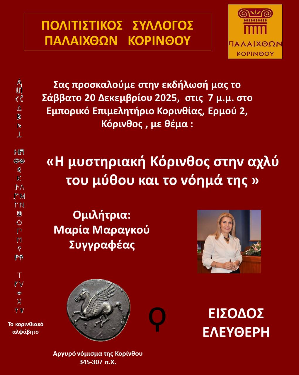 Εκδήλωση στο Επιμελητήριο Κορινθίας, διοργανώνει ο Σύλλογος ΠΑΛΑΙΧΘΩΝ ΚΟΡΙΝΘΟΥ, το Σάββατο