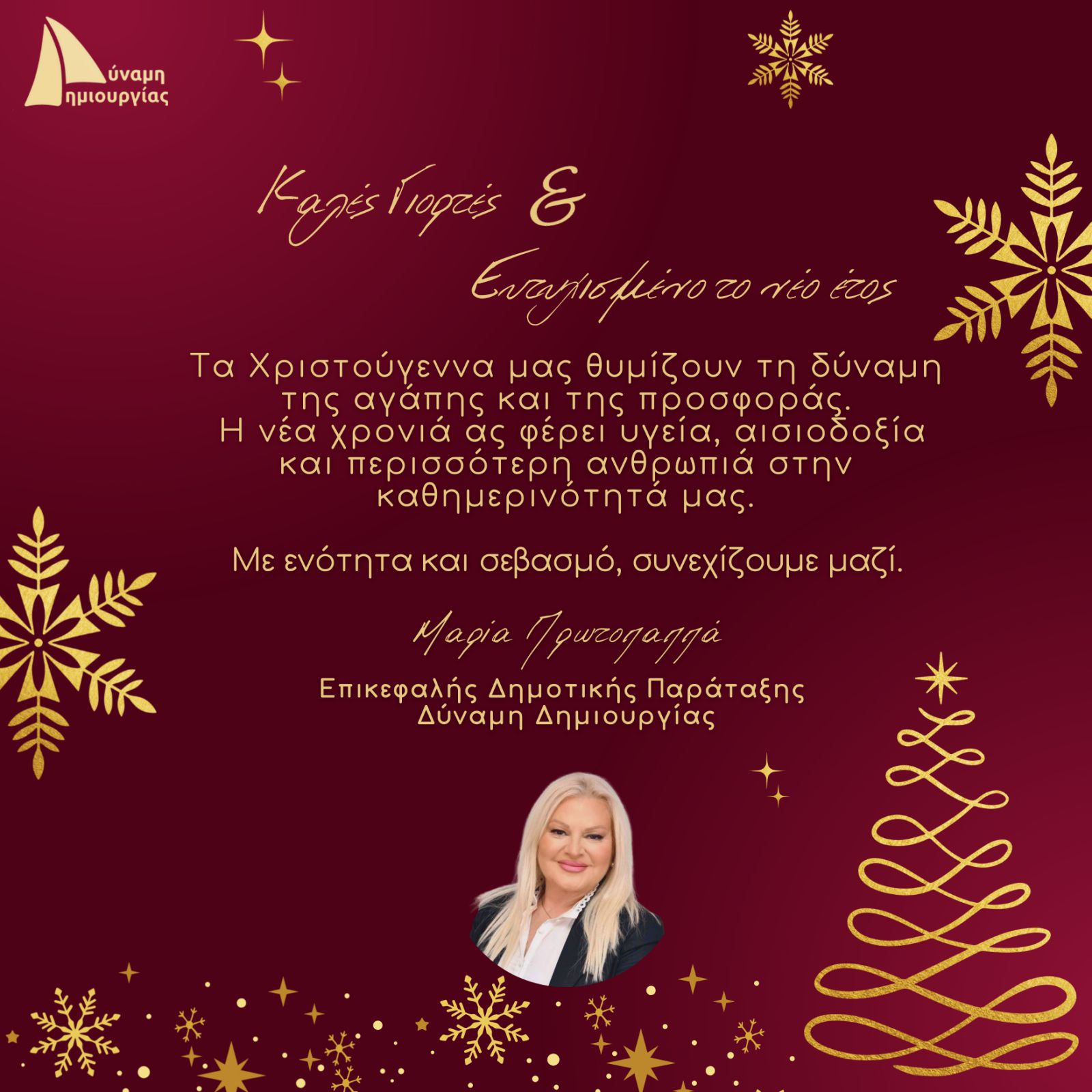 Η επικεφαλής της Δύναμης Δημιουργίας και επικεφαλής της αντιπολίτευσης του δήμου Λουτρακίου-Περαχώρας- Αγίων Θεοδώρων, στέλνει τις ευχές της για τις γιορτές!