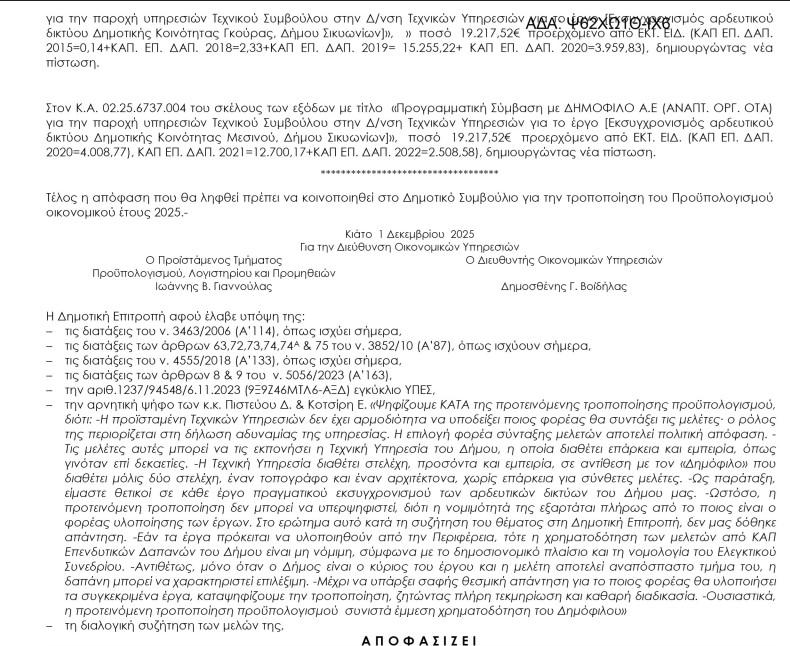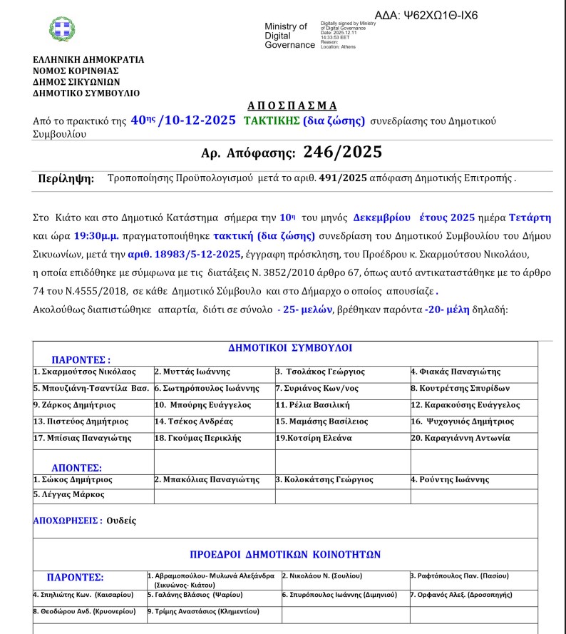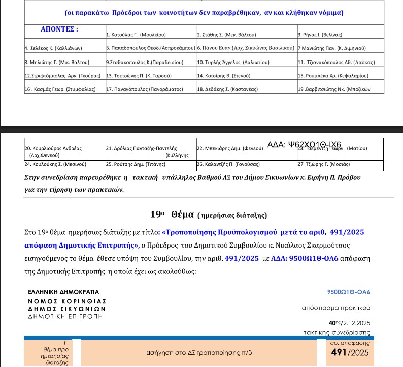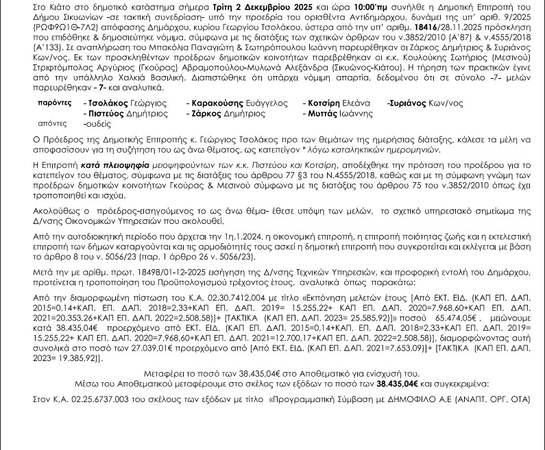 Κατά τη συνεδρίαση του Δημοτικού Συμβουλίου Σικυωνίων, με θέμα την τροποποίηση του προϋπολογισμού οικονομικού έτους 2025, η παράταξη «Επόμενη Μέρα» καταψήφισε ρητά και αιτιολογημένα την εισήγηση της δημοτικής αρχής.