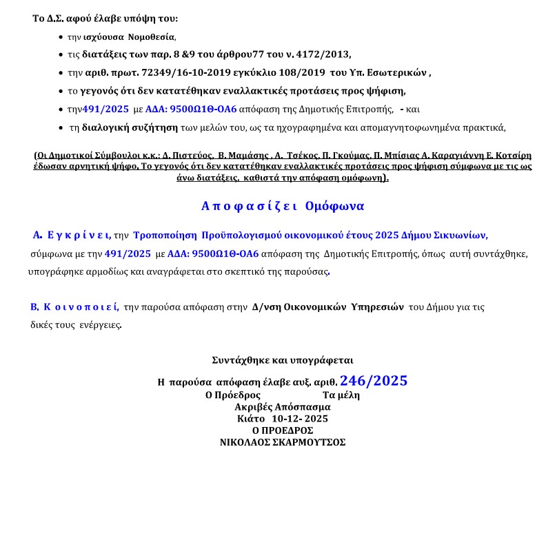 Παρά ταύτα, στην τελική διατύπωση της απόφασης αναφέρεται ότι αυτή ελήφθη ως «ομόφωνη», με το σκεπτικό ότι δεν κατατέθηκαν εναλλακτικές προτάσεις προς ψήφιση (αριθμ. απόφασης 246/2025 – ΑΔΑ: Ψ62ΧΩ1Θ-ΙΧ6).