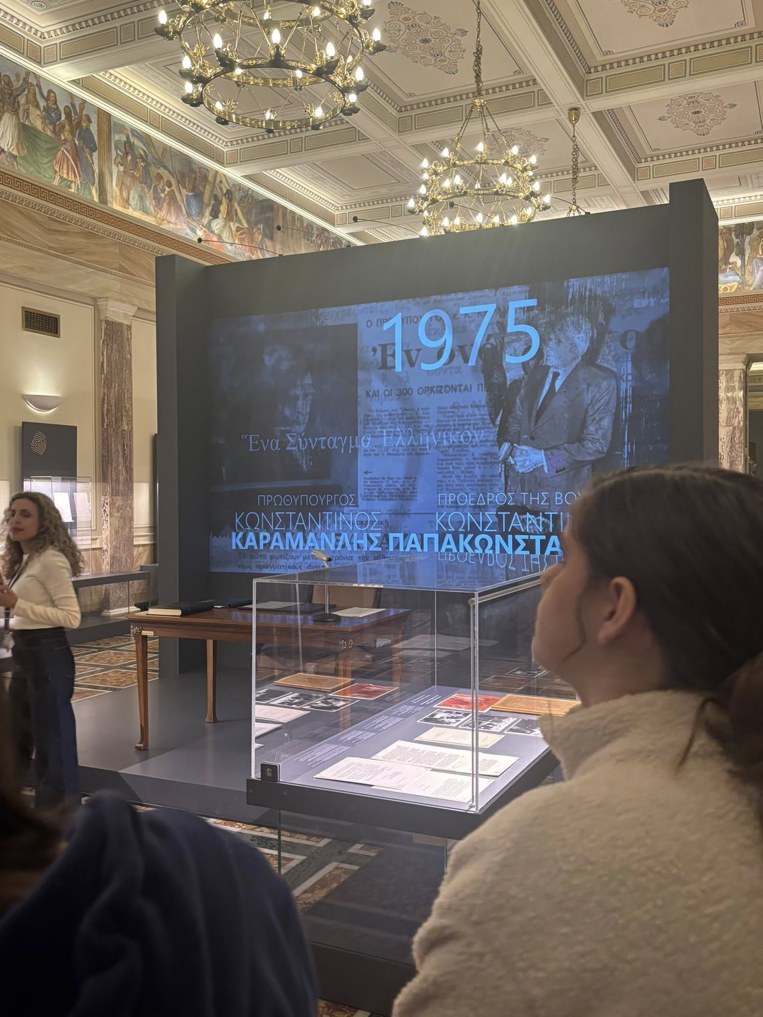 Η εξαιρετική ξεναγός μας μάς έδωσε όσες πληροφορίες χρειαζόμασταν για την ιστορία του κτιρίου και μας οδήγησε στην Έκθεση για το Σύνταγμα και τα Δικαιώματα