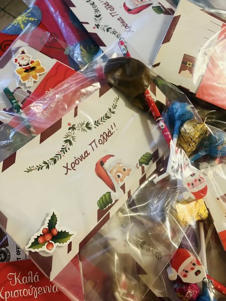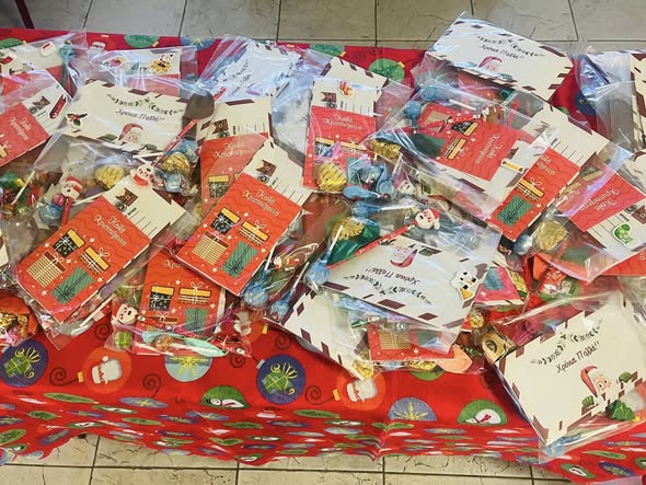 Μια τσαντούλα έκπληξη σε όλα τα παιδιά με ωραίες Χριστουγεννιάτικες λιχουδιές και πολλά δωράκια με πολλα χαμόγελα!