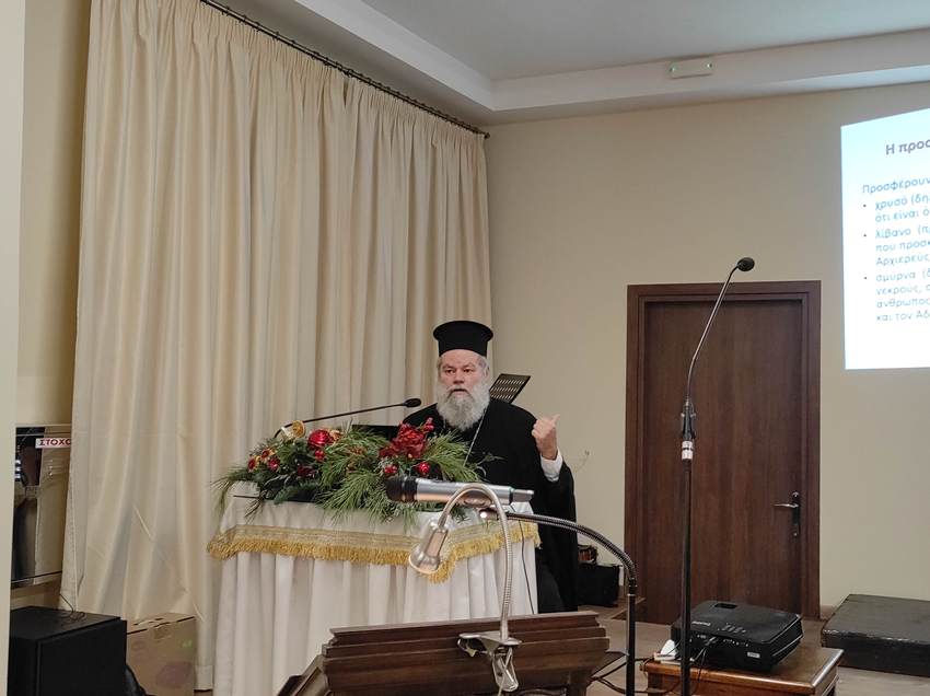 Στο δεύτερο μέρος της εκδήλωσης πραγματοποιήθηκε ομιλία από τον Διευθυντή του Ιδρύματος Νεότητος και Οικογένειας της Ι. Αρχιεπισκοπής Αθηνών, Πανοσ. Αρχιμ. π. Συμεών Βενετσιάνο, με θέμα: «Συνοδοιπόροι με τους σοφούς Μάγους σε μίαν "άλλη" Βηθλεέμ».