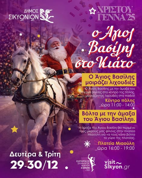11:00 – 14:00: Ο Άγιος Βασίλης βγαίνει στους δρόμους του Κιάτου με την άμαξά του και μοιράζει λιχουδιές σε όλα τα παιδιά!