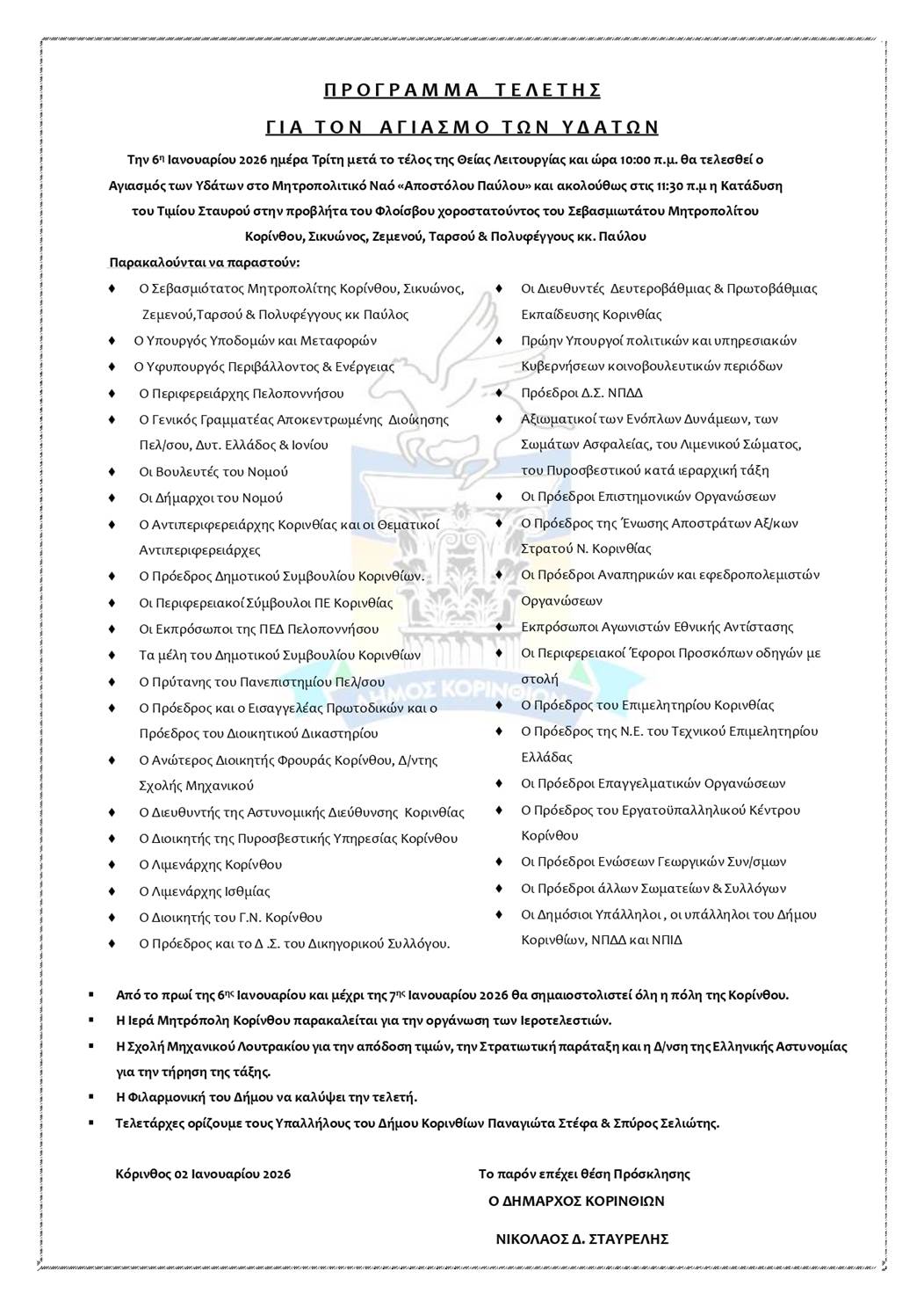 Κόρινθος: Πρόγραμμα εορτασμού των Θεοφανείων