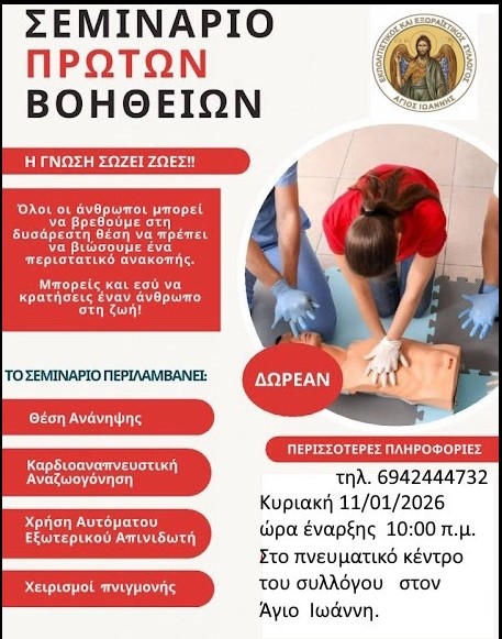 Ο σύλλογός μας διοργανώνει σεμινάριο Πρώτων Βοηθειών για τα μέλη μας και όλους τους Αγιαννιώτες.