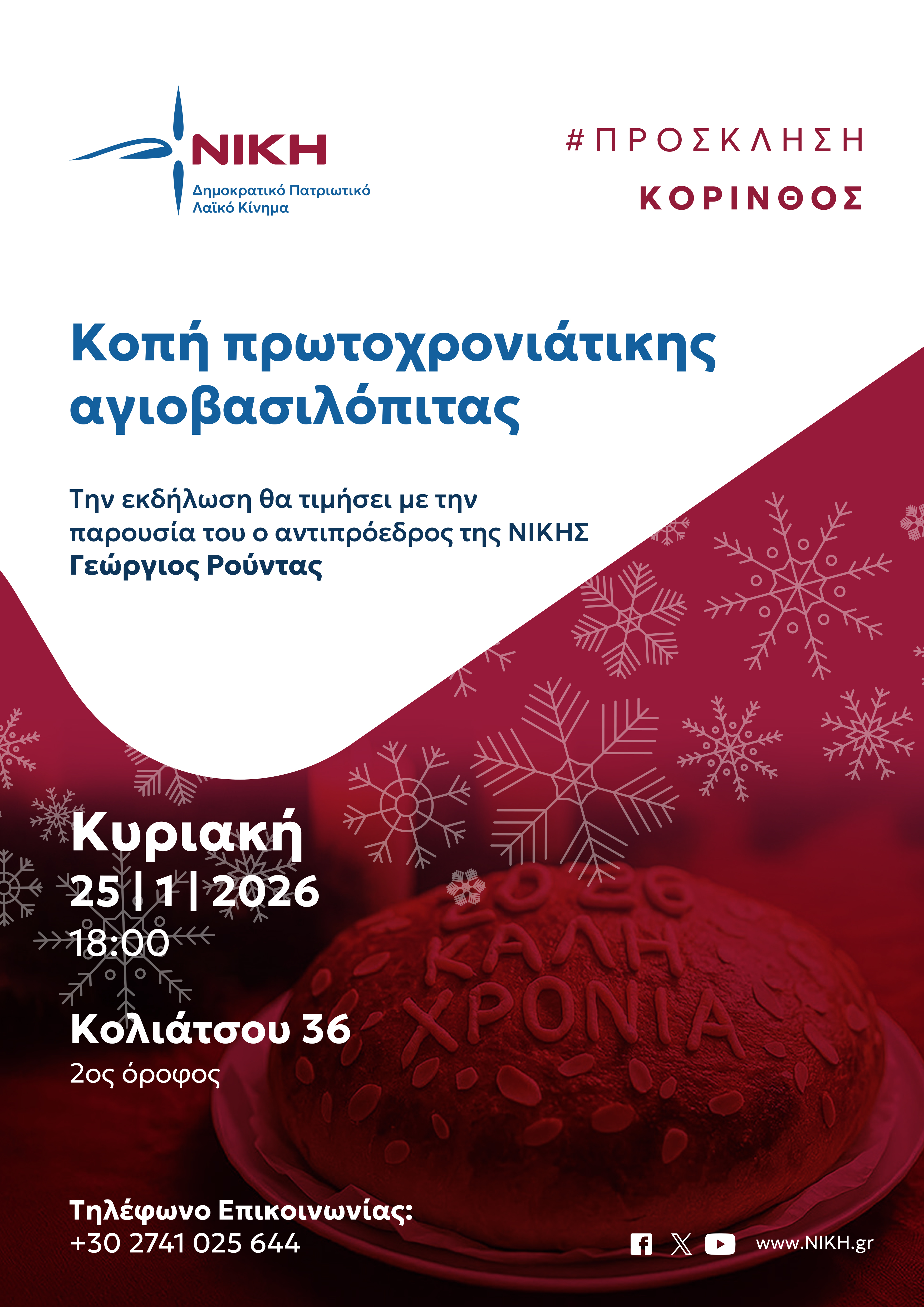 Θα θέλαμε να σας ενημερώσουμε ότι την Κυριακή 25 Ιανουαρίου στις 18.00 μ.μ. στο γραφείο του Δημοκρατικού Πατριωτικού Λαϊκού κινήματος ΝΙΚΗ στην Κόρινθο, οδός Κολιάτσου 36 (2ος όροφος), θα πραγματοποιηθεί εκδήλωση για την κοπή της αγιοβασιλόπιτας.