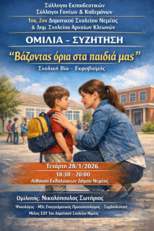 Οι Σύλλογοι Εκπαιδευτικών και οι Σύλλογοι Γονέων και Κηδεμόνων 1ου, 2ου Δημοτικού Σχολείου Νεμέας & Δημ. Σχολείου Αρχαίων Κλεωνών διοργανώνουν Ομιλία – Συζήτηση ”Βάζοντας όρια στα παιδιά μας” Σχολική Βία – Εκφοβισμός