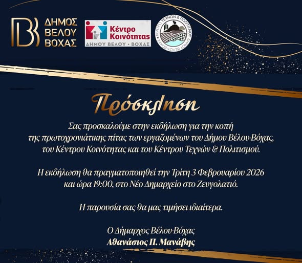 ΚΟΡΙΝΘΙΑΚΑ ΔΗΜΟΣ ΒΕΛΟΥ ΒΟΧΑΣ ΚΟΠΗ ΠΙΤΑΣ Δήμος Βέλου Βόχας: 𝚷𝛒ό𝛔𝛋𝛌𝛈𝛔𝛈 𝛔𝛕𝛈𝛎 𝛋𝛐𝛑ή 𝛕𝛈ς 𝚷𝛒𝛚𝛕𝛐𝛘𝛒𝛐𝛎𝛊ά𝛕𝛊𝛋𝛈ς 𝚷ί𝛕𝛂ς Ο 𝝙ή𝝻𝝾ς 𝝗έ𝝺𝝾𝞄-𝝗ό𝞆𝝰ς, το 𝝟έ𝝼𝞃𝞀𝝾 𝝟𝝾𝝸𝝼ό𝞃𝝶𝞃𝝰ς και το 𝝟έ𝝼𝞃𝞀𝝾 𝝩𝝴𝞆𝝼ώ𝝼 & 𝝥𝝾𝝺𝝸𝞃𝝸𝞂𝝻𝝾ύ σας προσκαλούν στην εκδήλωση για την κοπή της πρωτοχρονιάτικης πίτας των εργαζομένων. 28/01/2026 @ 12:53 Copied to clipboard Διαβάστε επίσης 27/01/2026 @ 16:19 Η Ακαδημία μπάσκετ του ΑΟΞ κόβει την πίτα του αυτό το Σάββατο 27/01/2026 @ 10:28 Ενημερωτική Ημερίδα από την Τροχαία Κορίνθου για την Κυκλοφοριακή Αγωγή στο Δημοτικό Σχολείο Βραχατίου 27/01/2026 @ 08:00 Κοπή πίτας για τον Εκκλησιαστικό Σύλλογο Βοχαϊκου «Άγιος Δημήτριος» 26/01/2026 @ 17:12 Ξεκίνησαν οι προετοιμασίες του Εμπορικού και Επιχειρηματικού Συλλόγου Βραχατίου για το Καρναβάλι 2026 26/01/2026 @ 10:17 Πλήθος κόσμου στην κοπή της πίτας της ΝΙΚΗΣ Κορινθίας (ΒΙΝΤΕΟ-ΦΩΤΟ) 𝝩𝞀ί𝞃𝝶 𝟯 𝝫𝝴𝝱𝞀𝝾𝞄𝝰𝞀ί𝝾𝞄 𝟮𝟬𝟮𝟲 Ώ𝞀𝝰: 𝟭𝟵:𝟬𝟬 𝝬ώ𝞀𝝾ς: 𝝢έ𝝾 𝝙𝝶𝝻𝝰𝞀𝞆𝝴ί𝝾 𝝛𝝴𝞄𝝲𝝾𝝺𝝰𝞃𝝸𝝾ύΗ παρουσία σας θα μας τιμήσει ιδιαίτερα και θα χαρούμε να ανταλλάξουμε ευχές για μια δημιουργική και παραγωγική χρονιά!Με εκτίμηση,Ο Δήμαρχος Βέλου-ΒόχαςΑθανάσιος Π. Μανάβης Ροή ειδήσεων 28/01/2026 @ 14:04 Κόρινθος: Υπεγράφη η σύμβαση για το «μπαλόνι» 28/01/2026 @ 12:53 Δήμος Βέλου Βόχας: 𝚷𝛒ό𝛔𝛋𝛌𝛈𝛔𝛈 𝛔𝛕𝛈𝛎 𝛋𝛐𝛑ή 𝛕𝛈ς 𝚷𝛒𝛚𝛕𝛐𝛘𝛒𝛐𝛎𝛊ά𝛕𝛊𝛋𝛈ς 𝚷ί𝛕𝛂ς 28/01/2026 @ 11:43 Όραση: Γιατί δακρύζουν τα μάτια στο κρύο; 28/01/2026 @ 11:13 Επισκέψεις μαθητών στον Σεβ. Μητροπολίτη Κορίνθου κ. Παύλο (ΦΩΤΟ) 28/01/2026 @ 10:51 Δήμος Σικυωνίων: Ένας «μαραθώνιος» έργων για την αντιπλημμυρική θωράκιση του παραλιακού μετώπου 28/01/2026 @ 10:33 Συλλυπητήριο μήνυμα του Εργατικού Κέντρου Κορίνθου για τις νεκρές εργάτριες της βιομηχανίας «ΒΙΟΛΑΝΤΑ» 28/01/2026 @ 10:24 Γ. Ψυχογιός: Πολιτική για τη νόμιμη μετανάστευση χωρίς κανόνες για όλους και κράτος δικαίου δεν γίνεται 27/01/2026 @ 20:00 Δήμος Σκυωνίων: Παρών σε εκδηλώσεις συλλόγων της περιοχής ο Δημήτρης Πιστεύος (ΦΩΤΟ) 27/01/2026 @ 19:23 Ξεκινάει αύριο την λειτουργία του ο Βρεφονηπιακός Σταθμός Αθικίων 27/01/2026 @ 19:01 Ο Δήμος Κορινθίων κοντά στους ανθρώπους, όπου υπάρχει ανάγκη 27/01/2026 @ 18:03 Κορινθία: Τα Δρομολόγια των Κινητών Αστυνομικών Μονάδων για την εβδομάδα 27/01/2026 @ 17:00 Στοχευμένες αστυνομικές επιχειρήσεις πραγματοποιήθηκαν στην Αργολίδα, στην Κορινθία και στη Μεσσηνία 27/01/2026 @ 16:19 Η Ακαδημία μπάσκετ του ΑΟΞ κόβει την πίτα του αυτό το Σάββατο 27/01/2026 @ 13:57 Aυτοκίνητο διέλυσε μαγαζί στο Λουτράκι(ΦΩΤΟ) 27/01/2026 @ 12:53 Μεγάλη εμπορική συμφωνία ΕΕ - Ινδίας δημιουργεί μια αγορά 2 δισ. πολιτών: Πόσο πέφτουν οι δασμοί, ποια ελληνικά προϊόντα αφορά, δείτε πίνακες 27/01/2026 @ 12:13 Καμία απάντηση του Γ.Γ. του ΝΑΤΟ Μ. Ρούτε στον Γ. Μανιάτη για το άρθρο 5 του ΝΑΤΟ. 27/01/2026 @ 11:00 Δημοσκόπηση Interview: Ανέτοιμη για το 70% η Καρυστιανού, 1 στους 2 έχει χειρότερη εικόνα μετά τη δήλωση για τις αμβλώσεις 27/01/2026 @ 10:38 Όταν η διεκδίκηση φέρνει αποτέλεσμα και η αδράνεια ψάχνει άλλοθι 27/01/2026 @ 10:33 Σε εκδηλώσεις κοπής πίτας ο Σεβ.Μητροπολίτης κ. Παύλος 27/01/2026 @ 10:30 Αναβάλλεται λόγω της τραγωδίας ο αγώνας Α.Ο Τρίκαλα – ΠΑΣ Κόρινθος Δείτε επίσης 27/01/2026 @ 13:57 Aυτοκίνητο διέλυσε μαγαζί στο Λουτράκι(ΦΩΤΟ) 27/01/2026 @ 12:53 Μεγάλη εμπορική συμφωνία ΕΕ - Ινδίας δημιουργεί μια αγορά 2 δισ. πολιτών: Πόσο πέφτουν οι δασμοί, ποια ελληνικά προϊόντα αφορά, δείτε πίνακες 27/01/2026 @ 12:13 Καμία απάντηση του Γ.Γ. του ΝΑΤΟ Μ. Ρούτε στον Γ. Μανιάτη για το άρθρο 5 του ΝΑΤΟ. 26/01/2026 @ 14:02 Παρατείνεται η προ