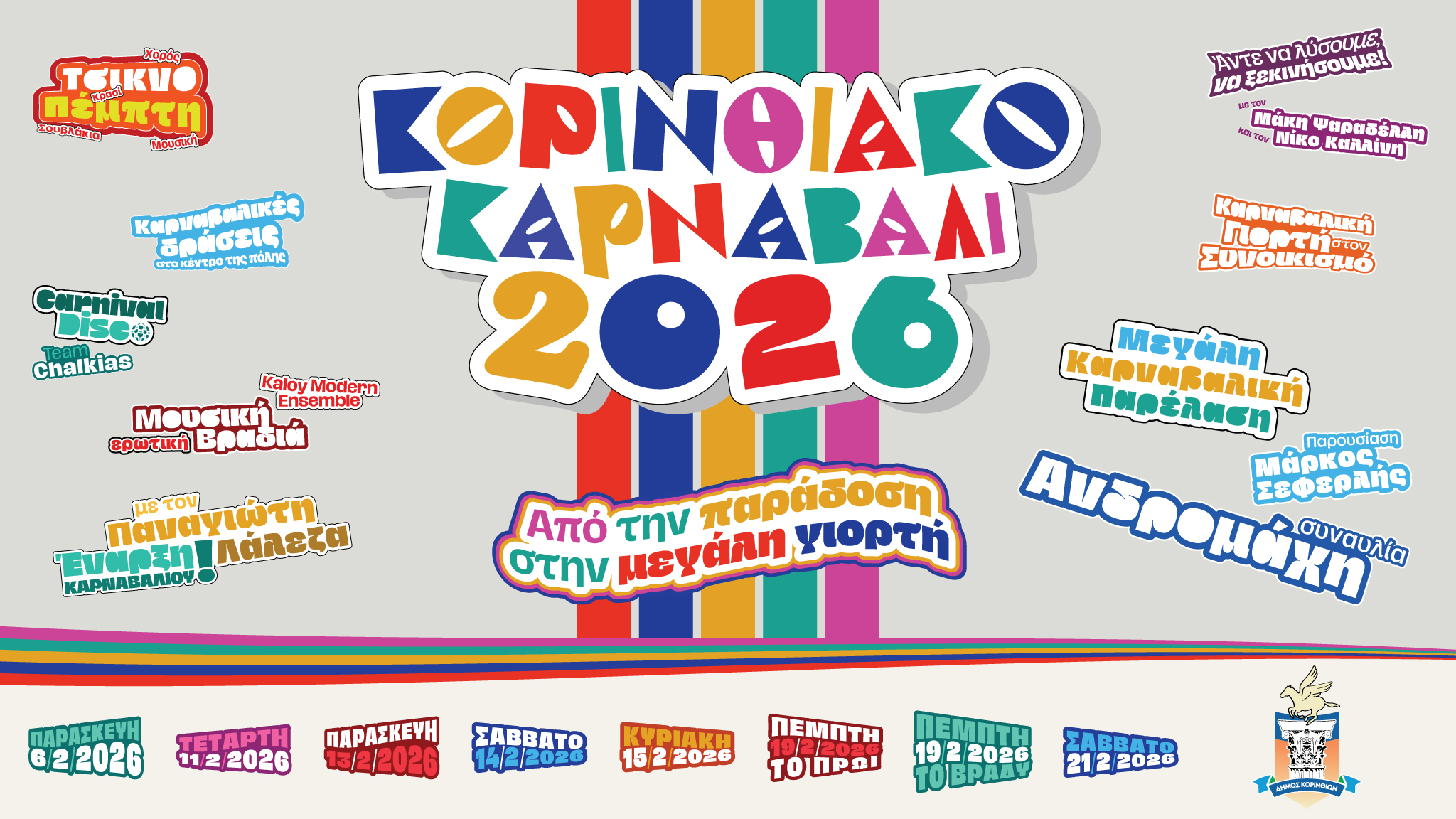 Από τις 6 έως τις 21 Φεβρουαρίου 2026 ο Δήμος Κορινθίων διοργανώνει το «Κορινθιακό Καρναβάλι 2026», παρουσιάζοντας ένα πλούσιο και ποικίλο πρόγραμμα γεμάτο μουσική, χορό, παιδικές δράσεις, παραδοσιακά έθιμα και μεγάλες εκδηλώσεις, που ξετυλίγονται στους δρόμους και τις πλατείες της πόλης, ενώ -και φέτος- δεν θα λείψουν αποκριάτικα δρώμενα και κούλουμα στις κοινότητες του Δήμου μας.
