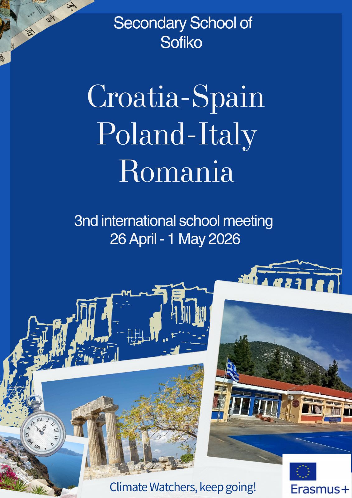 Το Γυμνάσιο-Λ.Τ. Σοφικού Κορινθίας, συνεχίζοντας τις δράσεις εξωστρέφειας του Σχολείου και στα πλαίσια περαιτέρω διάχυσης των αποτελεσμάτων του προγράμματος ERASMUS + CLIMATE WATCHERS, διοργανώνει την 3η Διεθνή Συνάντηση Σχολείων στο Σοφικό από τις 26 Απριλίου έως την 1η Μαΐου 2026.