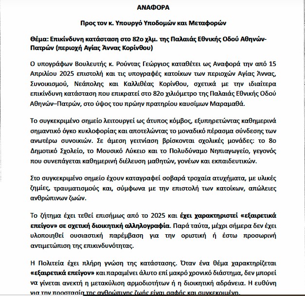 Με την κοινοβουλευτική παρέμβαση ζητείται σαφές και δεσμευτικό χρονοδιάγραμμα υλοποίησης μόνιμης λύσης, καθώς και άμεσα προσωρινά μέτρα σήμανσης και ασφάλειας.