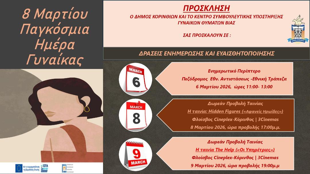 Το Κέντρο Συμβουλευτικής Υποστήριξης Γυναικών Θυμάτων Βίας Δήμου Κορινθίων παρέχει δωρεάν υπηρεσίες σε γυναίκες που έχουν υποστεί ή υφίστανται οποιαδήποτε μορφή έμφυλης βίας ή/και πολλαπλές διακρίσεις, με πλήρη σεβασμό στο απόρρητο της συμβουλευτικής διαδικασίας.