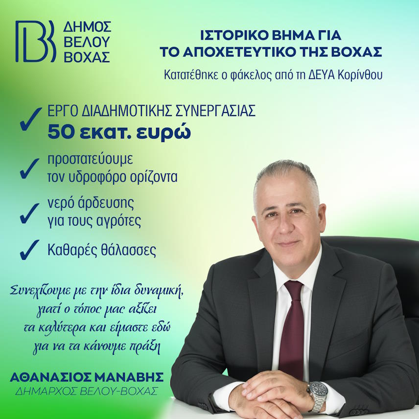 Το μέγεθος της παρέμβασης, που αγγίζει τα 50 εκατομμύρια ευρώ, δείχνει ότι ο Δήμος Βέλου-Βόχας με συνεργασία και καθαρό σχέδιο, μετατρέπει μια χρόνια ανάγκη σε μοχλό ανάπτυξης, προστατεύοντας το περιβάλλον και θωρακίζοντας την οικονομία. Συνεχίζουμε με την ίδια δυναμική, γιατί ο τόπος μας αξίζει τα καλύτερα και είμαστε εδώ για να τα κάνουμε πράξη».