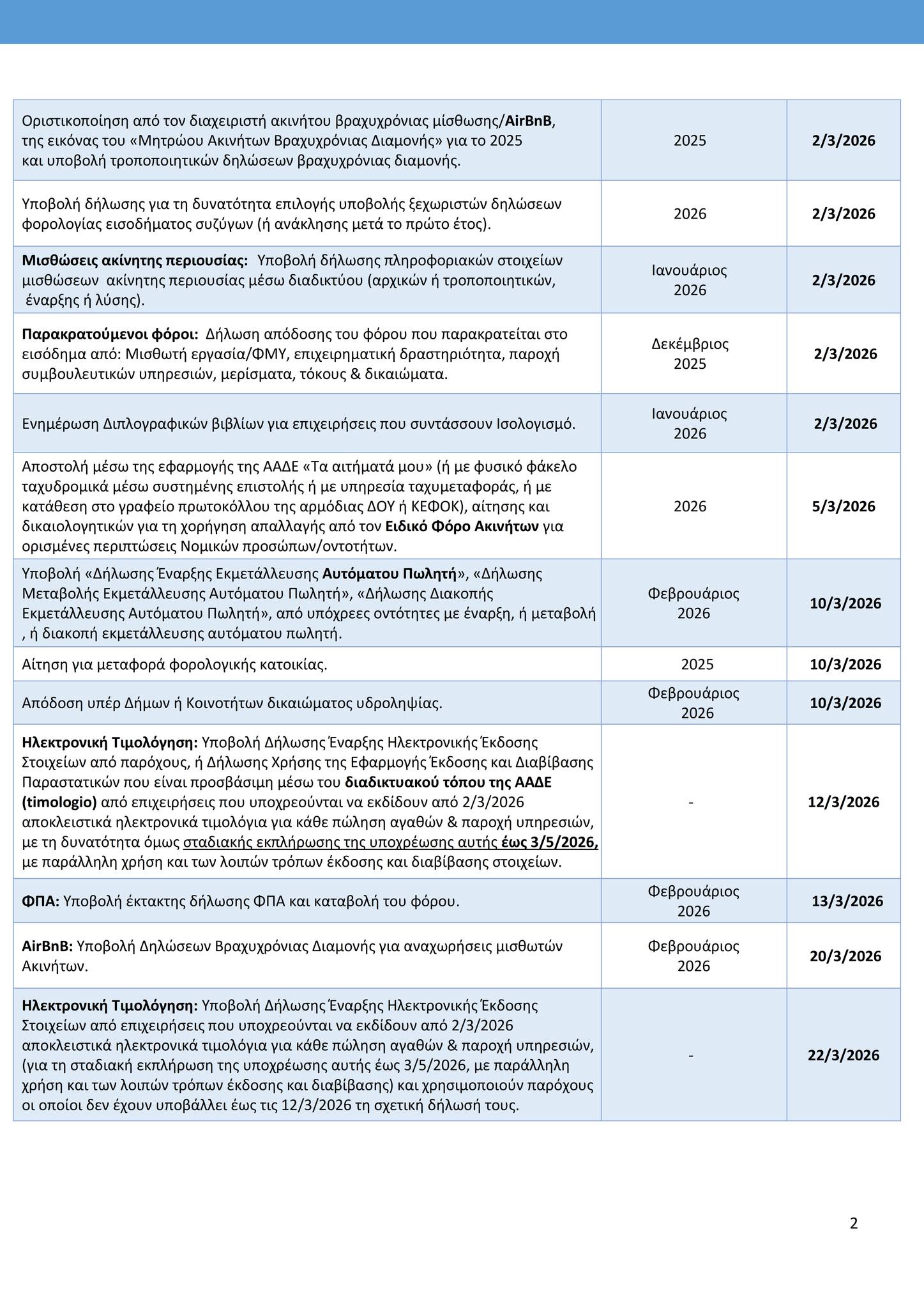 Στο πλαίσιο αυτό, σας αποστέλλουμε το παρόν Ενημερωτικό Δελτίο για τις «Κυριότερες Υποχρεώσεις τρέχοντος μηνός των Εμπορικών Επιχειρήσεων», στο οποίο καταγράφονται αναλυτικά οι υποχρεώσεις ανά θεματικές κατηγορίες προς: ΑΑΔΕ, e - ΕΦΚΑ, ΕΡΓΑΝΗ, ΟΤΑ/Δήμους κ.α. Επιπλέον, επισημαίνονται οι καταληκτικές ημερομηνίες διευθέτησής τους, ενώ σε περίπτωση χορήγησης παρατάσεων θα υπάρχει άμεση ενημέρωσή σας.