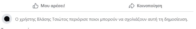 Κάτω από την ανάρτηση του κ. Τσιώτου υπήρξαν σχόλια δημοτών που εκφράζουν κριτική ή διαφωνία με τη στάση της δημοτικής αρχής. Αντί να αξιοποιηθεί η ευκαιρία για διάλογο και εξήγηση των θέσεων του, δήμαρχος, επέλεξε να απενεργοποιήσει την δυνατότητα νέων σχολίων.