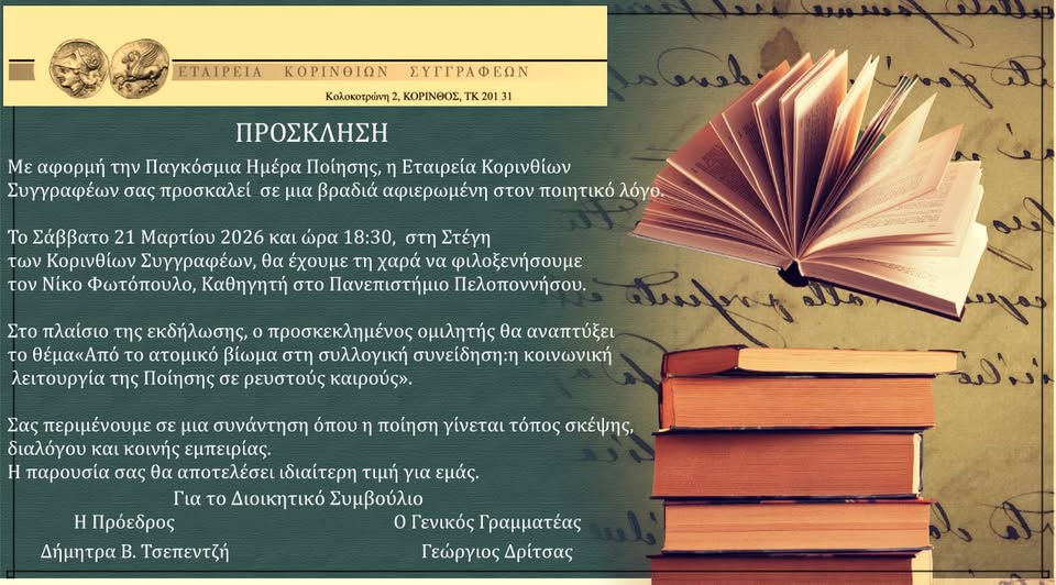 Με ιδιαίτερη χαρά στηρίζουμε την εκδήλωση της Εταιρείας Κορινθίων Συγγραφέων για την Παγκόσμια Ημέρα Ποίησης.