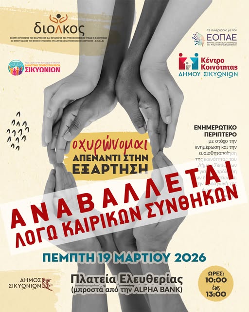 19/03/2026 @ 10:21 Δήμος Σικυωνίων: Αναβάλλεται η προγραμματισμένη για σήμερα εκδήλωση «Οχυρωνόμαστε απέναντι στην εξάρτηση»!