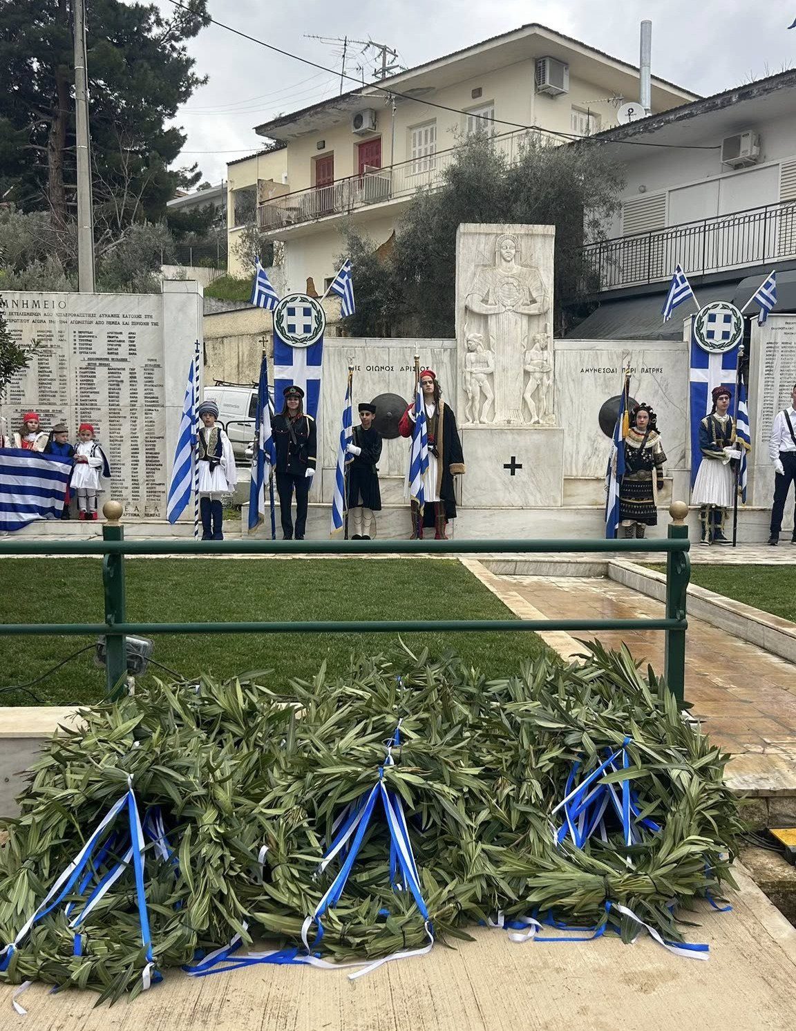 Το πρόγραμμα των εκδηλώσεων συνεχίστηκε με επιμνημόσυνη δέηση και κατάθεση στεφάνων στο Μνημείο των Πεσόντων, αποδίδοντας τον πρέποντα φόρο τιμής στους ήρωες του ’21.