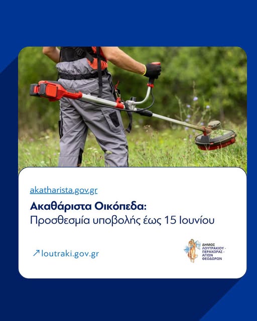 Ο Δήμος Λουτρακίου – Περαχώρας – Αγίων Θεοδώρων ενημερώνει ότι όλοι οι ιδιοκτήτες και υπόχρεοι οικοπέδων οφείλουν να προχωρήσουν σε καθαρισμό των χώρων τους έως τις 15 Ιουνίου, συμβάλλοντας στην πρόληψη πυρκαγιών.