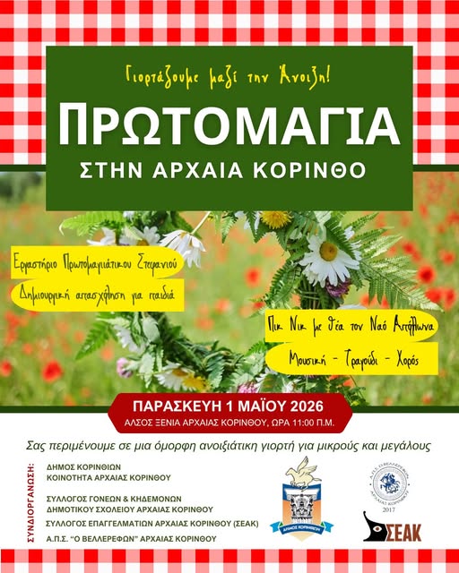 Ο Δήμος Κορινθίων, σε συνεργασία με την Κοινότητα Αρχαίας Κορίνθου, τον Σύλλογο Γονέων και Κηδεμόνων, τον ΣΕΑΚ (Σύλλογο Επαγγελματιών Αρχαίας Κορίνθου) και τον Α.Π.Σ. "Ο ΒΕΛΛΕΡΕΦΩΝ" Αρχαίας Κορίνθου, σας προσκαλεί να γιορτάσουμε μαζί την Πρωτομαγιά, στο Ξενία Αρχαίας Κορίνθου, σε μια όμορφη ανοιξιάτικη γιορτή για μικρούς και μεγάλους, γεμάτη λουλούδια, μουσική και δημιουργία.