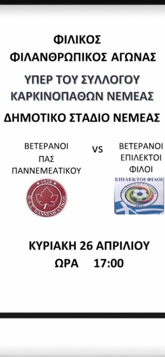 Έναν ξεχωριστό φιλανθρωπικό αγώνα ποδοσφαίρου, με μήνυμα ζωής και ελπίδας, διοργανώνεται την Κυριακή το απόγευμα στη Νεμέα, με στόχο τη στήριξη του Συλλόγου Καρκινοπαθών της περιοχής.