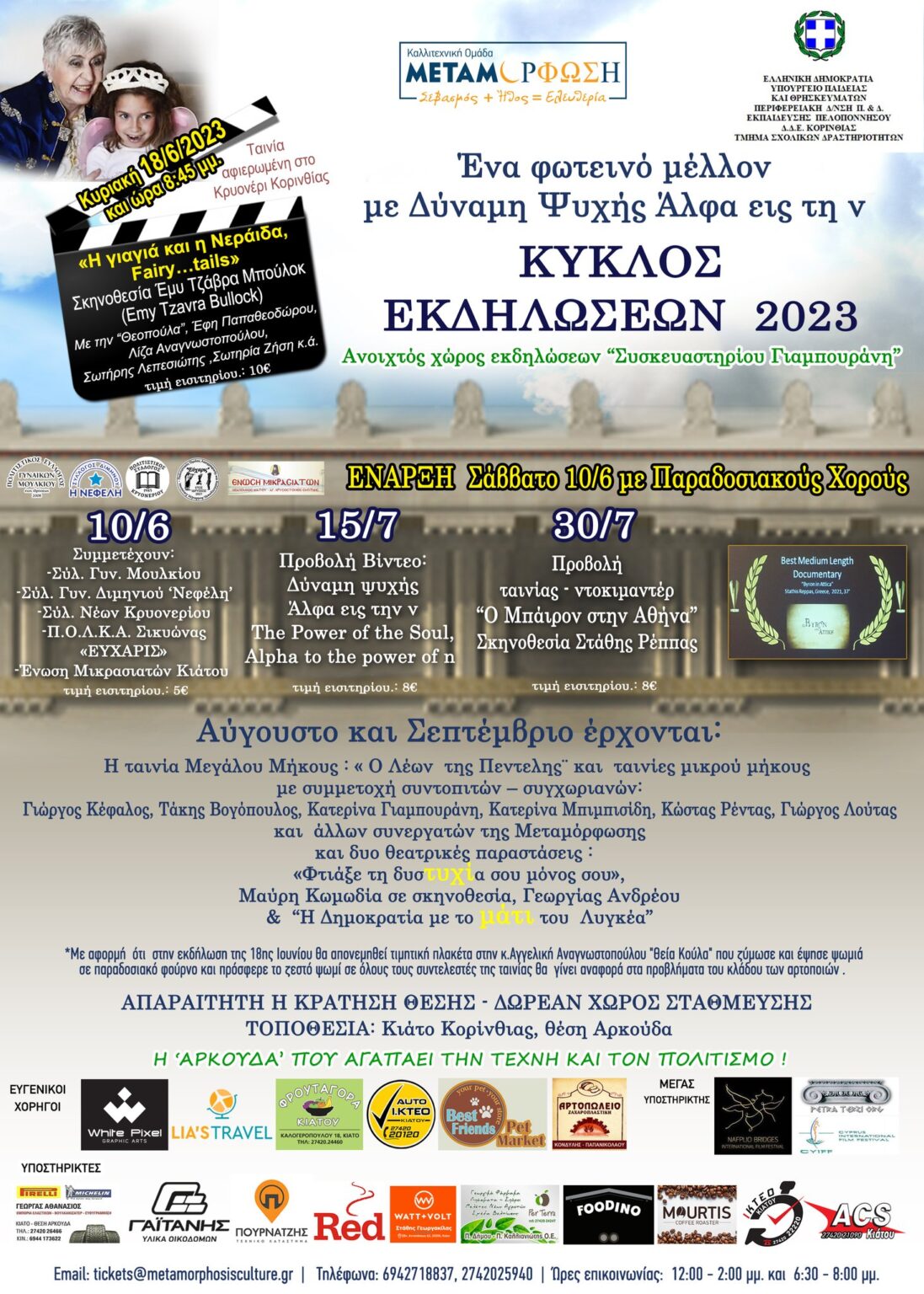 H Καλλιτεχνική Ομάδα ”Μεταμόρφωση” με όραμα την στήριξη του εγχώριου Πολιτιστικού, Μορφωτικού Τουρισμού και την ψυχαγωγία του ανθρώπου, υποδέχεται το φετινό καλοκαίρι με Δύναμη ψυχής Άλφα εις την ν’ και οργανώνει τον πρώτο κύκλο εκδηλώσεων με θέμα:
