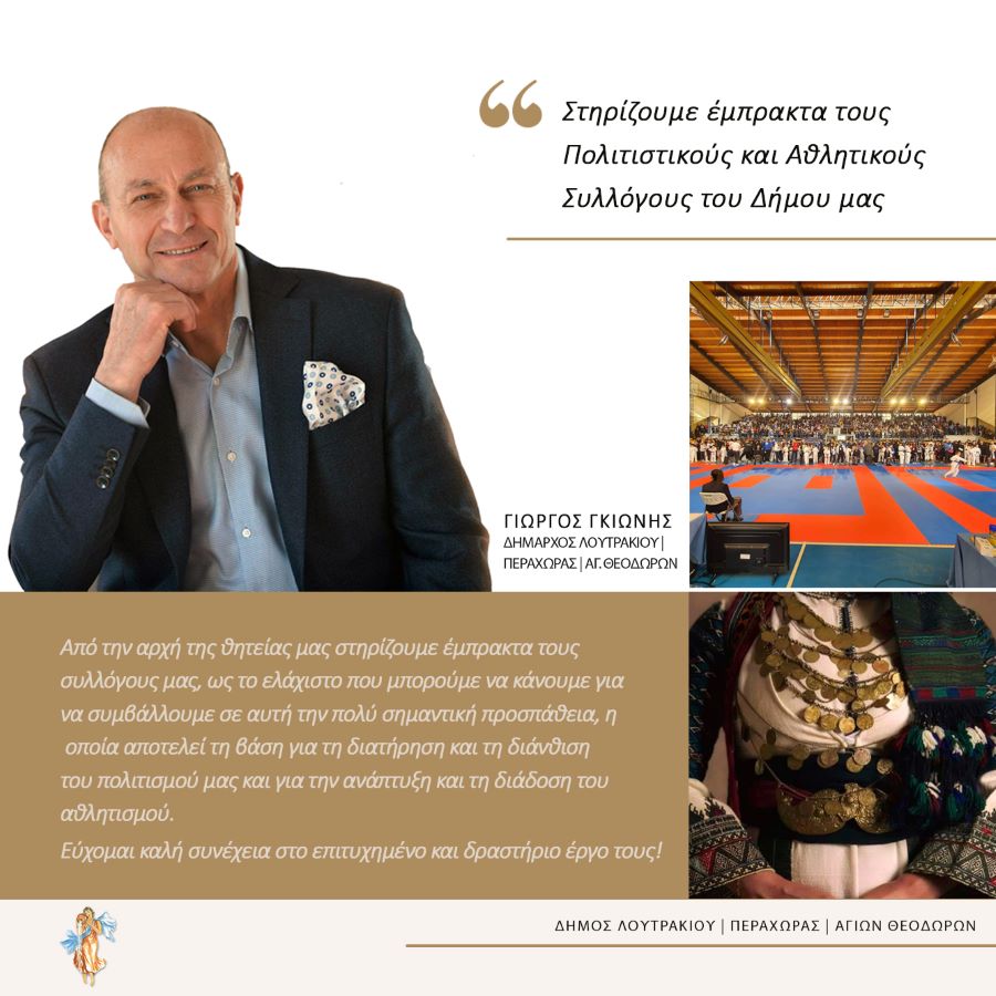 Ο Δήμαρχος Λουτρακίου – Περαχώρας – Αγίων Θεοδώρων Γιώργος Γκιώνης δήλωσε σχετικά: «Είμαστε περήφανοι που ο Δήμος μας έχει τόσο δραστήριους Πολιτιστικούς Συλλόγους οι οποίοι πρεσβεύουν και προάγουν με τον καλύτερο τρόπο τον πολιτισμό του τόπου μας και Αθλητικά Σωματεία που μας κάνουν περήφανους με τις επιδόσεις τους. Είμαστε από τους ελάχιστους Δήμους της Περιφέρειας Πελοποννήσου που παρέχει κάθε χρόνο επιχορηγήσεις στους συλλόγους του τόπου του.