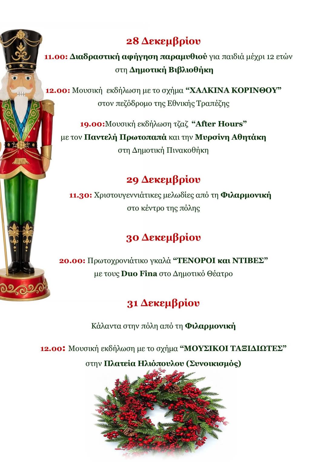 ΚΟΡΙΝΘΙΑΚΑ ΧΡΙΣΤΟΥΓΕΝΝΙΑΤΙΚΕΣ ΕΚΔΗΛΩΣΕΙΣ ΠΡΟΓΡΑΜΜΑ ΔΗΜΟΣ ΚΟΡΙΝΘΙΩΝ Χριστουγεννιάτικο πρόγραμμα του Δήμου Κορινθίων Δείτε το πρόγραμμα των εκδηλώσεων που έχει προγραμματίσει ο Δήμος Κορινθίων. 16/12/2024 @ 10:47 Copied to clipboard Διαβάστε επίσης 13/12/2025 @ 11:55 Συνάντηση εργασίας του Προέδρου του Επιμελητηρίου Κορινθίας με τον Μητροπολίτη Κορίνθου κ.κ. Παύλο και τους Δημάρχους Κορινθίων και Σικυωνίων 13/12/2025 @ 10:54 Κόρινθος: Οι δηλώσεις συμμετοχής για το XMAS Night Run Korinthos 2025 άνοιξαν! 12/12/2025 @ 13:56 Κόρινθος: Έκθεση έργων της Συλλογής–Δωρεάς του Nicholas Egon στη Δημοτική Πινακοθήκη 12/12/2025 @ 13:37 Μαθητές Δημοτικού Σχολείου Άσσου βοήθησαν στον στολισμό του Χριστουγεννιάτικου Χωριού στο κέντρο της Κορίνθου (ΦΩΤΟ) 12/12/2025 @ 12:54 Μάγεψε χθες η Κόρινθος! (ΦΩΤΟ) Τα Χριστούγεννα έφτασαν. Δείτε το πρόγραμμα των εκδηλώσεων που έχει προγραμματίσει ο Δήμος Κορινθίων. Ξεκινάμε αύριο το απόγευμα στις 6.30, που θα ανάψουμε το Χριστουγεννιάτικο Δέντρο στα Περιβολάκια και συνεχίζουμε με εκδηλώσεις για μικρούς και μεγάλους. Ροή ειδήσεων 13/12/2025 @ 13:16 24ωρη Πανελλαδική – Πανδημοσιοϋπαλληλική Απεργία στις 16 Δεκεμβρίου 13/12/2025 @ 12:30 Τάσος Ξύδης: Αγρότες και κοινωνία: μια κοινή μάχη για την τροφή, τη δημοκρατία και το μέλλον 13/12/2025 @ 12:30 Ψήφισμα ΚΕΕΕ από τη ΓΣ των Πατρών για τη συμπαράστασηστον αγώνα των αγροτών και κτηνοτρόφων 13/12/2025 @ 11:55 Συνάντηση εργασίας του Προέδρου του Επιμελητηρίου Κορινθίας με τον Μητροπολίτη Κορίνθου κ.κ. Παύλο και τους Δημάρχους Κορινθίων και Σικυωνίων 13/12/2025 @ 10:54 Κόρινθος: Οι δηλώσεις συμμετοχής για το XMAS Night Run Korinthos 2025 άνοιξαν! 12/12/2025 @ 17:27 ΠΑΣΟΚ - ΟΠΕΚΕΠΕ: Διαγράφεται ο Γιώργος Λαμπράκης που συνελήφθη για το σκάνδαλο 12/12/2025 @ 17:09 Νεμέα: Φωταγώγηση του χριστουγεννιάτικου δέντρου 12/12/2025 @ 13:56 Κόρινθος: Έκθεση έργων της Συλλογής–Δωρεάς του Nicholas Egon στη Δημοτική Πινακοθήκη 12/12/2025 @ 13:37 Μαθητές Δημοτικού Σχολείου Άσσου βοήθησαν στον στολισμό του Χριστουγεννιάτικου Χωριού στο κέντρο της Κορίνθου (ΦΩΤΟ) 12/12/2025 @ 12:54 Μάγεψε χθες η Κόρινθος! (ΦΩΤΟ) 12/12/2025 @ 12:47 «100 φιλιά καληνύχτας» στην Κόρινθο με βαθιά ανθρωπιστικό σκοπό 12/12/2025 @ 11:10 Συνελήφθησαν 9 άτομα σε αστυνομικές επιχειρήσεις σε Αργολίδα και Κορινθία 12/12/2025 @ 10:40 Παράνομες επιδοτήσεις από τον ΟΠΕΚΕΠΕ: 15 συλλήψεις στην Κρήτη - Έλαβαν πάνω από 1,7 εκατ. ευρώ 12/12/2025 @ 10:18 Ακριβότερο το τραπέζι των Χριστουγέννων το 2025 σε σχέση με το τραπέζι του 2024 12/12/2025 @ 10:04 ΟΕΕ: Τρεις προτάσεις για το Εθνικό Πρόγραμμα Ανάπτυξης 2026-2030 11/12/2025 @ 18:39 Στη Βουλή με πρωτοβουλία Ψυχογιού οι αποζημιώσεις για τη φονική πυρκαγιά του 2024 στη Δυτ. Κορινθία 11/12/2025 @ 18:33 Νέος πρόεδρος του Eurogroup ο Κυριάκος Πιερρακάκης 11/12/2025 @ 18:28 Η Δημοτική Φιλαρμονική Δερβενίου στην 5η συνάντηση Φιλαρμονικών Ακράτας 11/12/2025 @ 14:37 Σάμος: 12χρονος μετανάστης διαμελίστηκε από προπέλα σκάφους 11/12/2025 @ 13:54 Πρόσκληση Εορτασμού του Πολιούχου της Τοπικής Κοινότητας Λυγιάς του Δήμου Ξυλοκάστρου - Ευρωστίνης Δείτε επίσης 12/12/2025 @ 10:40 Παράνομες επιδοτήσεις από τον ΟΠΕΚΕΠΕ: 15 συλλήψεις στην Κρήτη - Έλαβαν πάνω από 1,7 εκατ. ευρώ 11/12/2025 @ 11:02 Έργα και Ημέραι Σταύρου Δανιήλ στην Κόρινθο 11/12/2025 @ 10:09 Δολοφονία Λυγγερίδη: Oι καθυστερήσεις στη δίκη βλάπτουν τη δικαιοσύνη 10/12/2025 @ 13:04 ΣΤΑΥΡΕΛΗΣ: Δύο χιλιόμετρα νέας ασφάλτου στον δρόμο Καλογερολίμανο Σοφικό(ΒΙΝΤΕΟ) 10/12/2025 @ 12:22 ΒΡΑΧΑΤΙ: Πωλείται πιτσαρία πλήρως εξοπλισμένη(ΦΩΤΟ) 10/12/2025 @ 11:37 Επίθεση Anadolu κατά Ελλάδας με... μυθολογία για την "εχθρική στάση ενάντια στη σύμμαχο" Τουρκία 10/12/2025 @ 