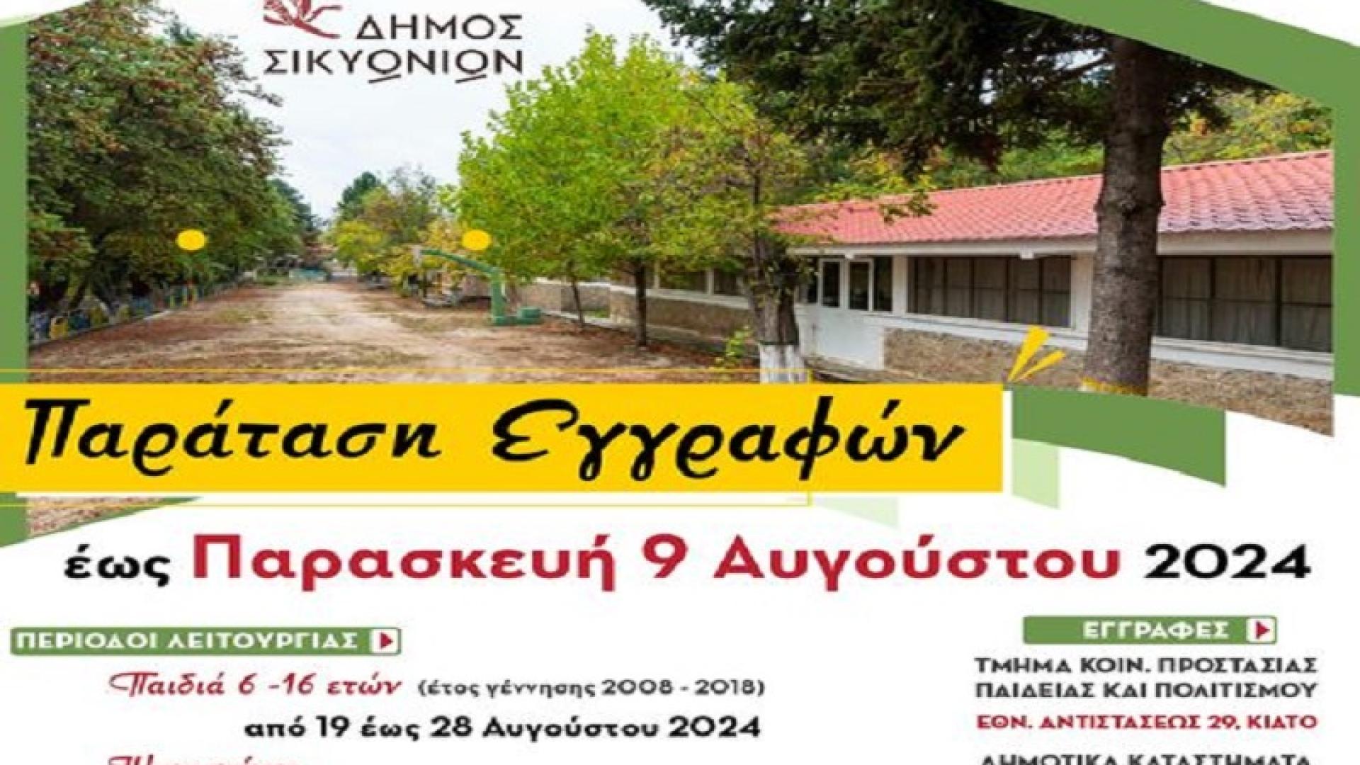 ΚΟΡΙΝΘΙΑΚΑ 02/08/2024 @ 17:00 Δήμος Σικυωνιών: Παρατείνεται η περίοδος εγγραφών και για τις δύο κατασκηνωτικές περιόδους της Κατασκήνωσης Η΄ Κορίνθου Κλημεντίου έως τις 9 Αυγούστου