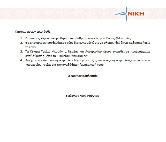 Με την κοινοβουλευτική του ερώτηση, ο βουλευτής της ΝΙΚΗΣ ζητά να διευκρινιστούν οι λόγοι ακύρωσης του έργου στα Φιλιατρά, αν θα επαναπροκηρυχθεί άμεσα νέος διαγωνισμός, καθώς και ποιος είναι ο σχεδιασμός του Υπουργείου Υγείας για την αναβάθμιση των Κέντρων Υγείας της Μεσσήνης, της Νεμέας και του Λουτρακίου.