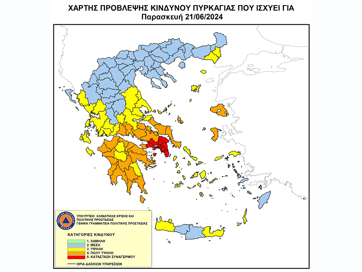 Σύμφωνα με το Χάρτη Πρόβλεψης Κινδύνου Πυρκαγιάς, τον οποίο εκδίδει η Γενική Γραμματεία Πολιτικής Προστασίας του Υπουργείου Κλιματικής Κρίσης & Πολιτικής Προστασίας για την Παρασκευή 21 Ιουνίου προβλέπεται πολύ υψηλός κίνδυνος δασικής πυρκαγιάς (κατηγορία κινδύνου 4) σε όλους τους Νομούς της Περιφέρειας Πελοποννήσου.