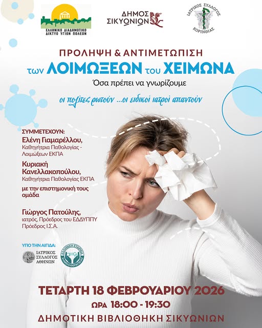 Ο Δήμος Σικυωνίων, σε συνεργασία με το ΕΔΔΥΠΠΥ και τον Ιατρικό Σύλλογο Κορινθίας, διοργανώνει μια επίκαιρη ενημερωτική εκδήλωση για την πρόληψη και την αντιμετώπιση των χειμερινών λοιμώξεων.